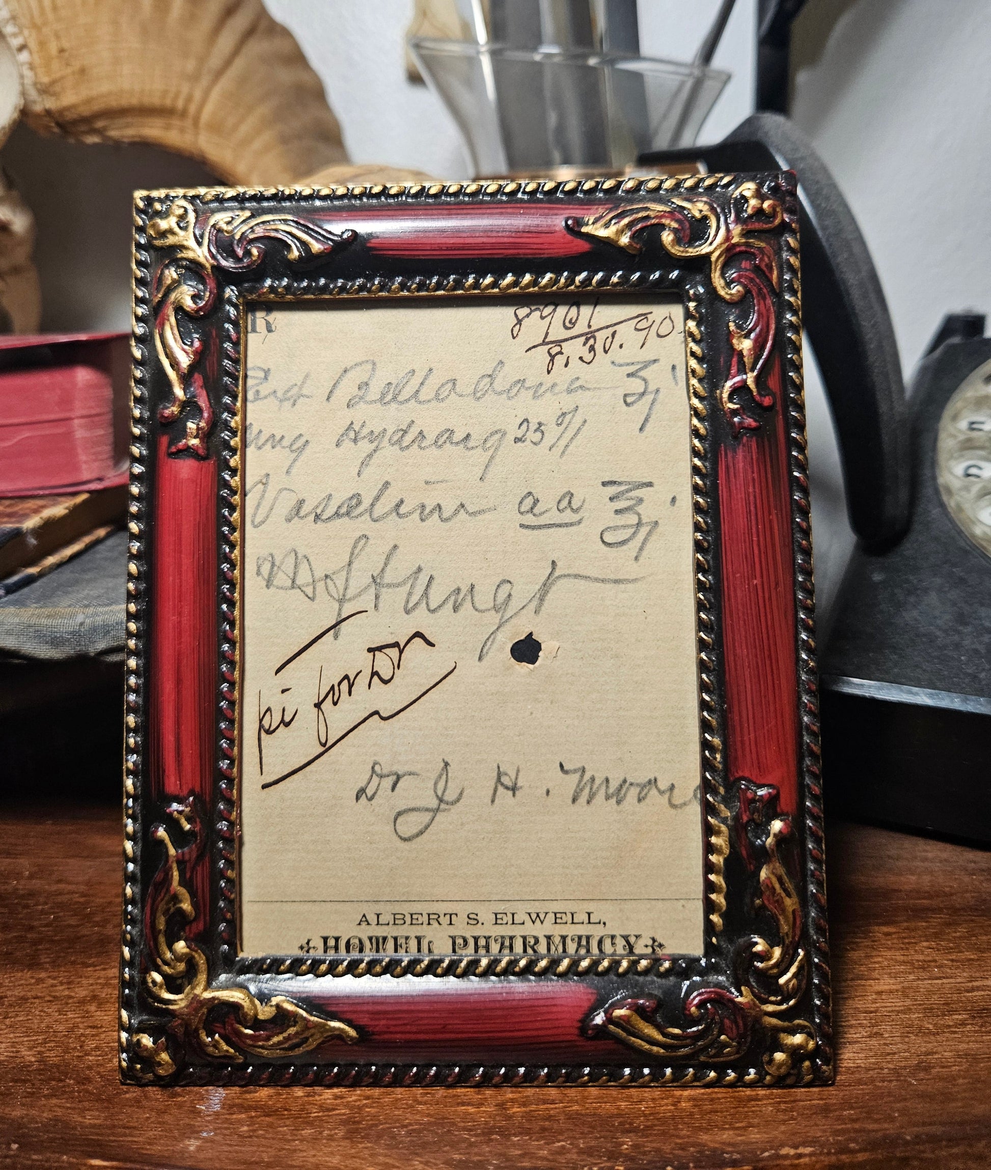 Various hand written antique prescription slips in frames. They're a mix between copies and originals all with dates. All from the 1890s.
