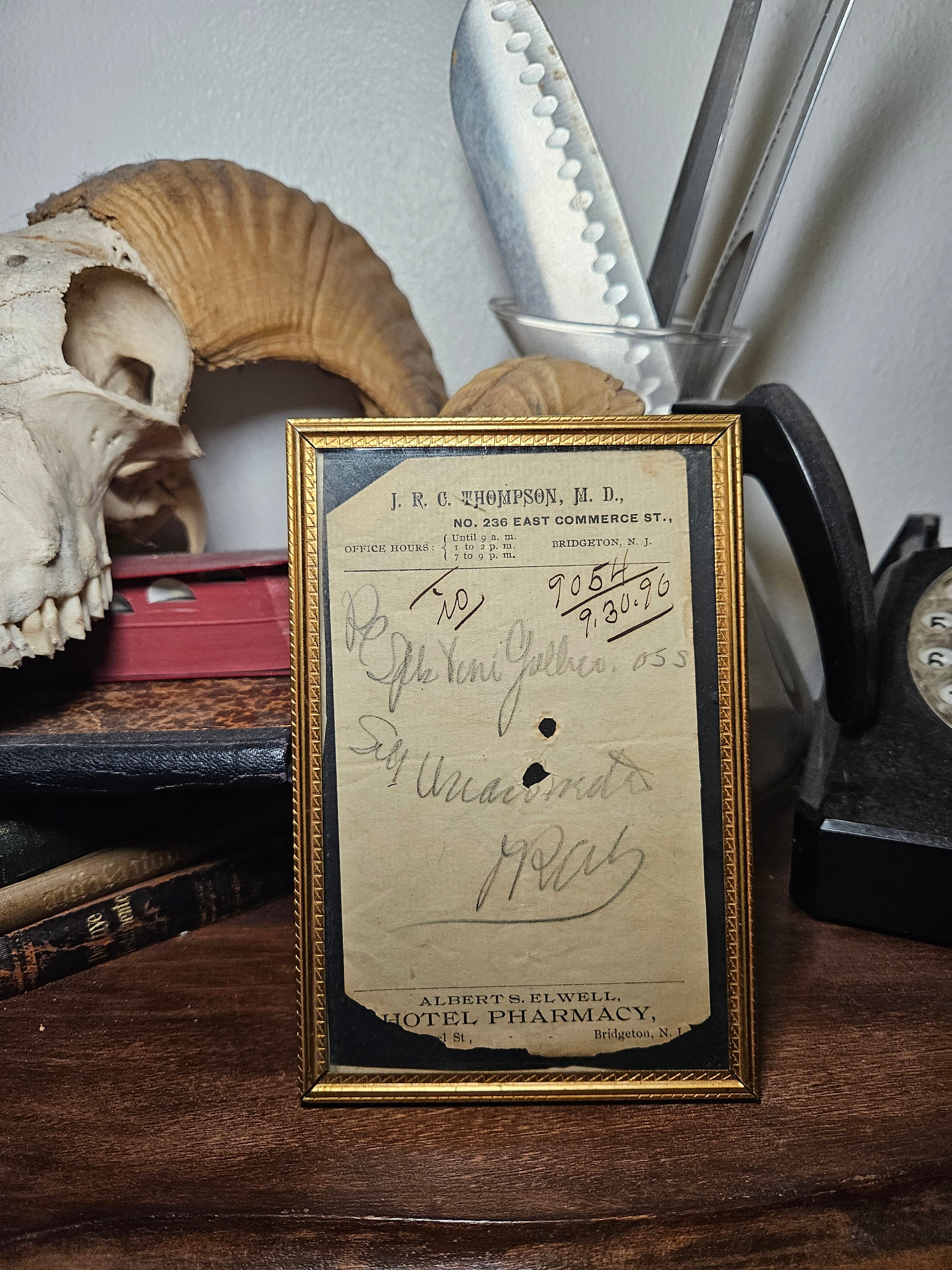 Various hand written antique prescription slips in frames. They're a mix between copies and originals all with dates. All from the 1890s.