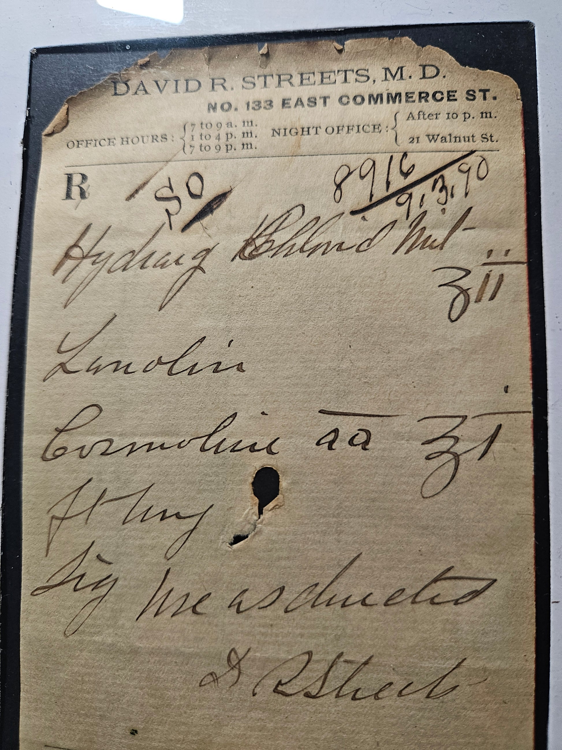 Various hand written antique prescription slips in frames. They're a mix between copies and originals all with dates. All from the 1890s.