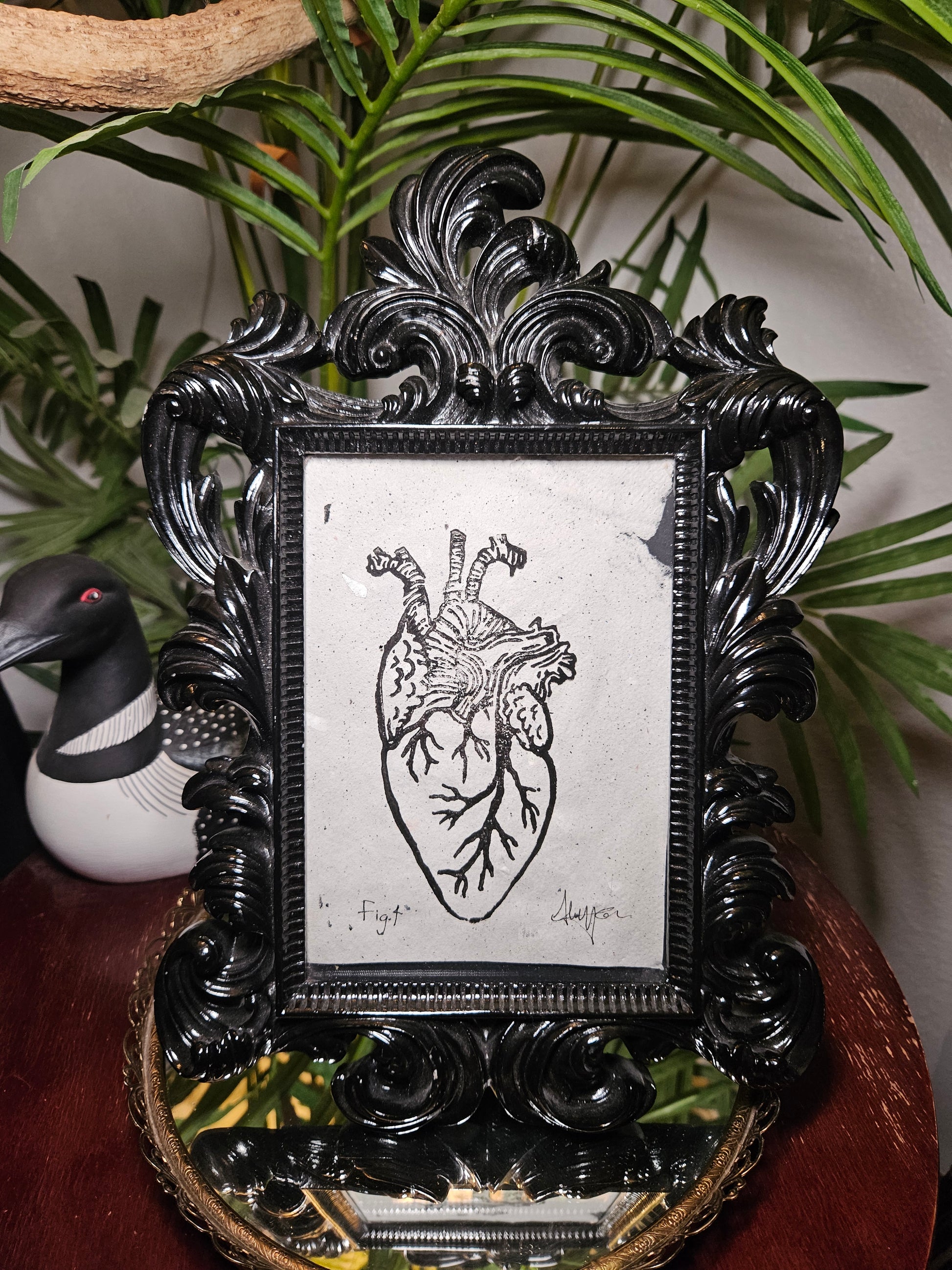 Rubber linocut anatomical heart printed on in house recycled paper. Easel back vintage frame.