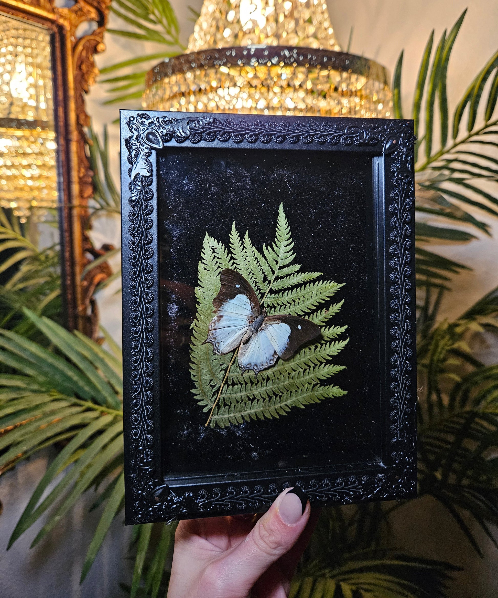 A gorgeous Nawab butterfly with hints of blue and green resting on a dried ferns and shown in a 5x7 shadowbox with a wall hanger