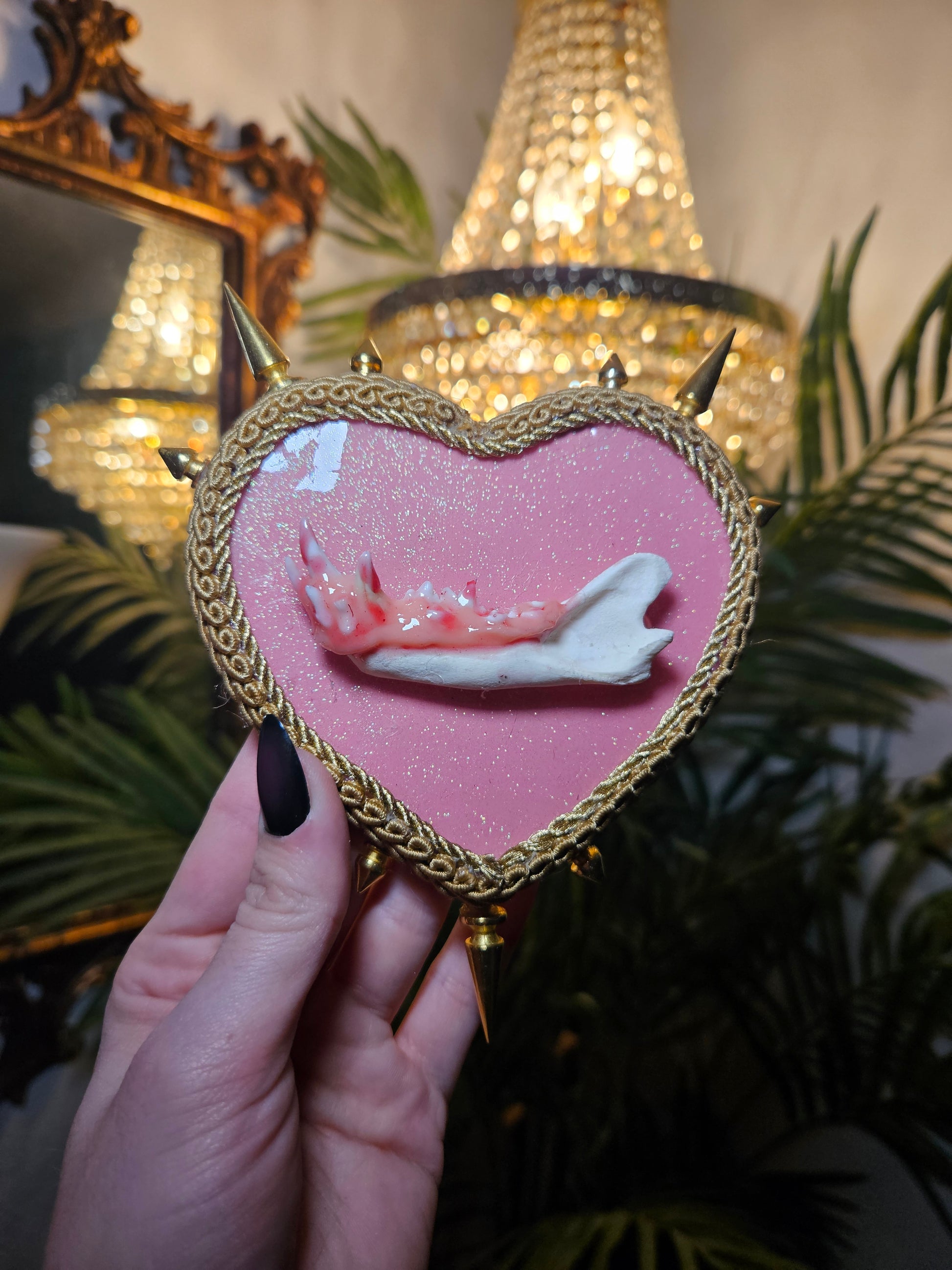 a feline creature jaw bone shown on a glittering heart shaped plaque with a wall hanger