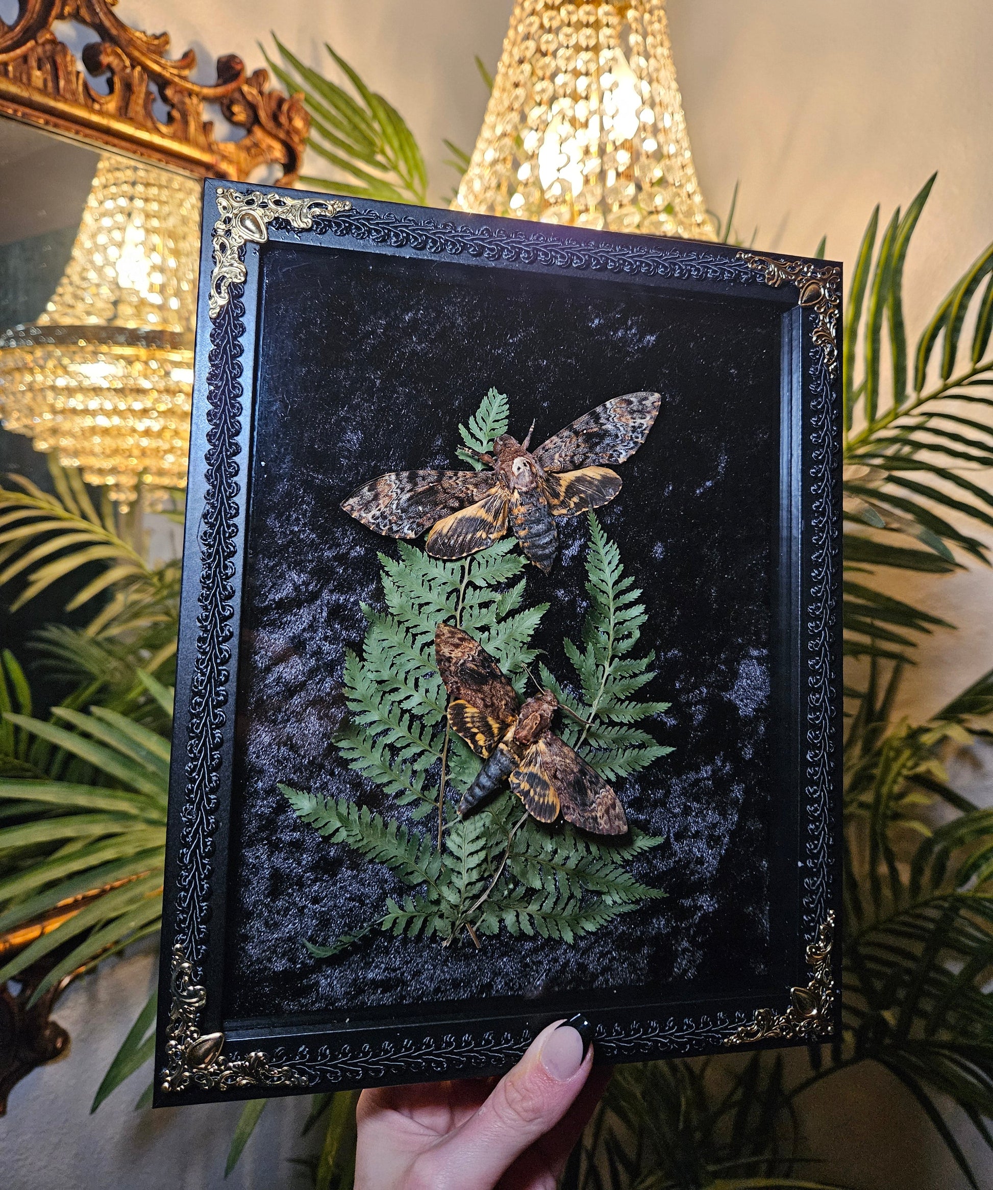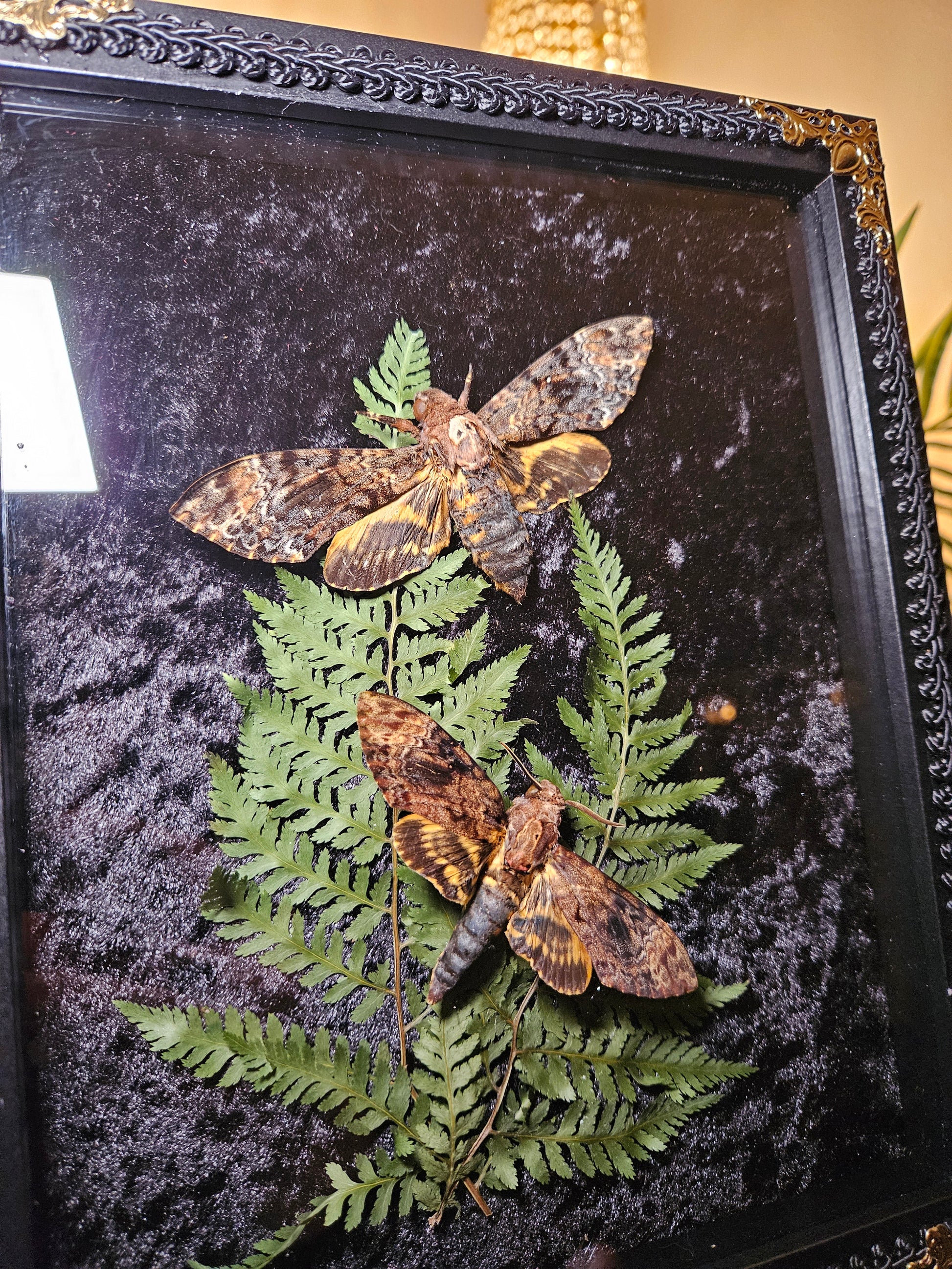 A beautiful pair of deaths head hawkmoths dancing on a dried ferns shown in an 8x10 shadowbox with a wall hanger