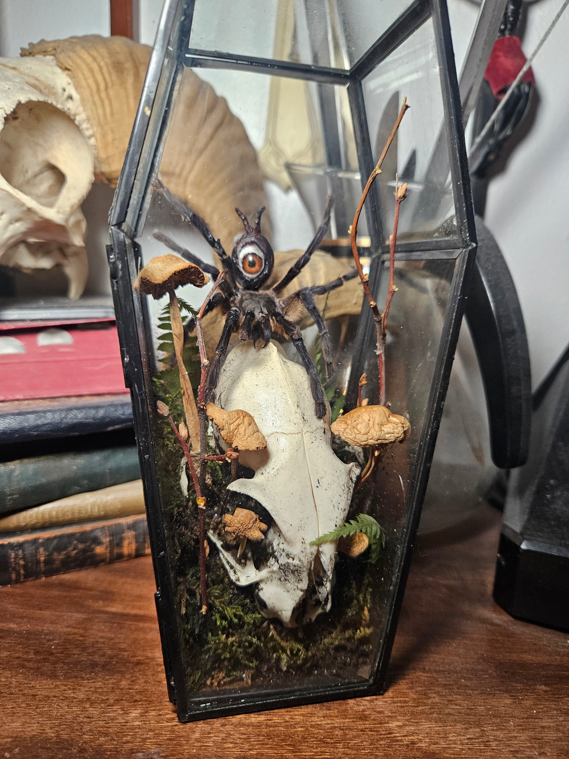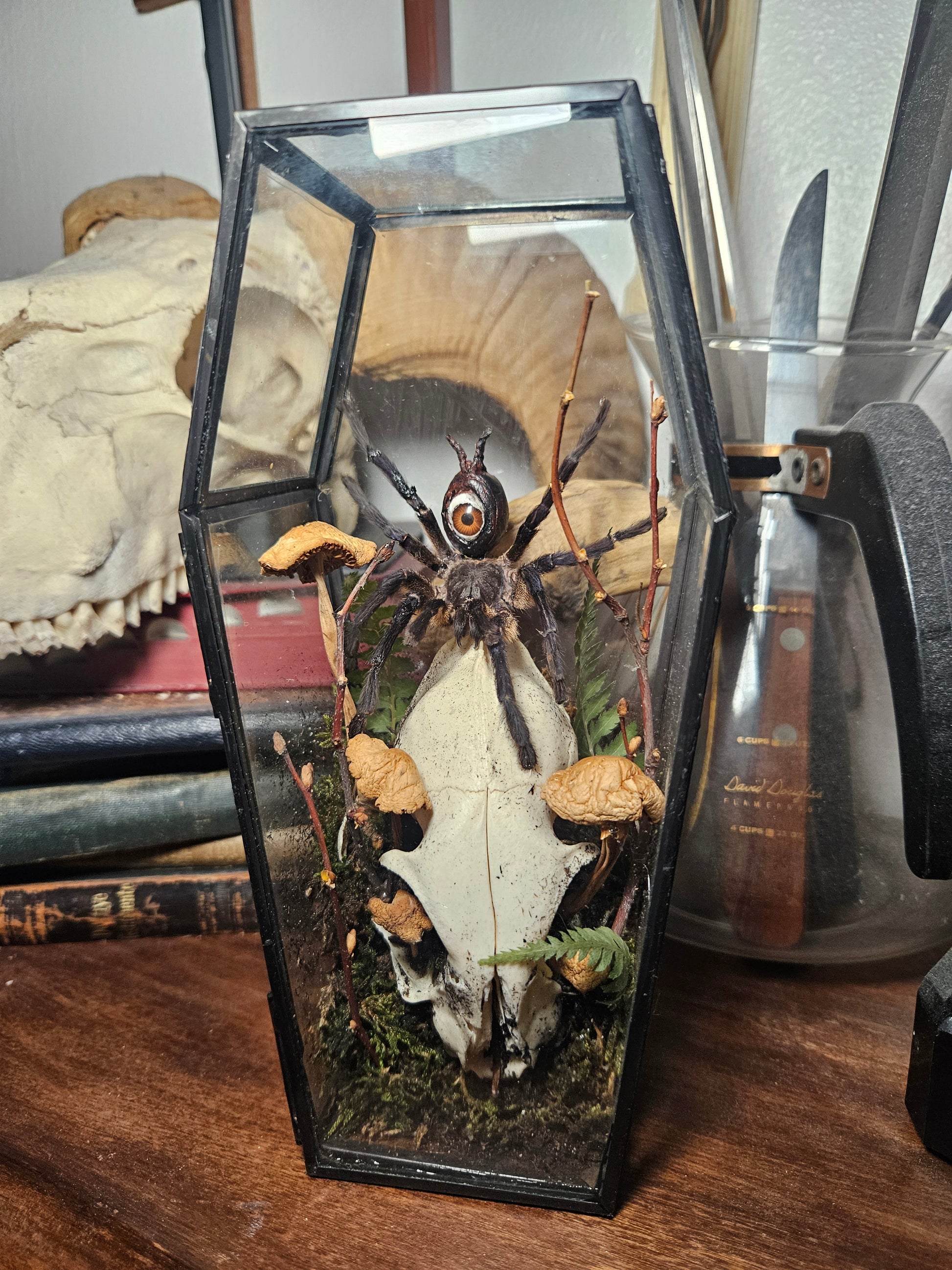A haunting glass coffin display shown with a cat skull, mushrooms, twigs and the all seeing eye tarantula