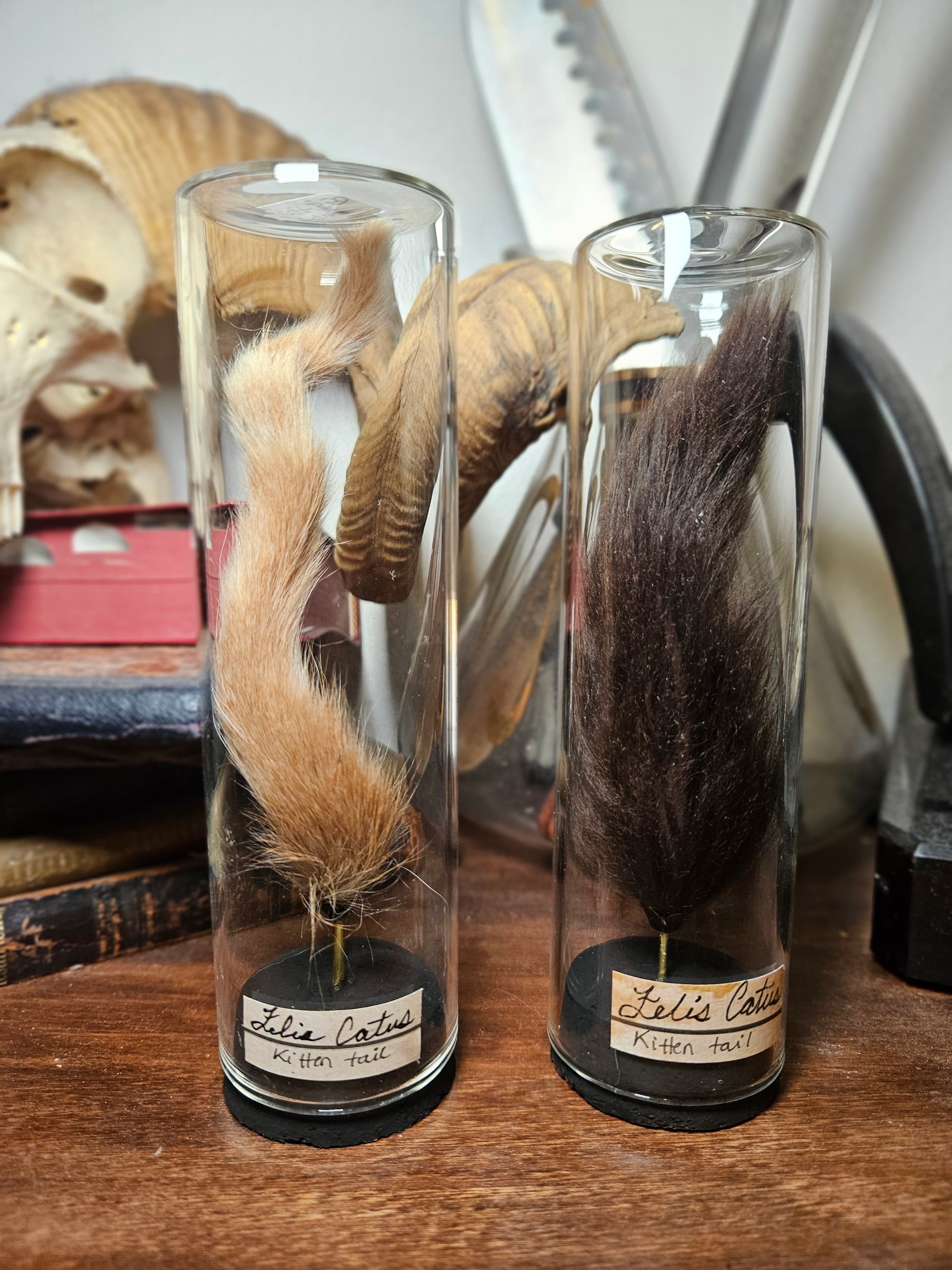 Adorable mummified kitten tails, feral, shown in an antique style glass curio