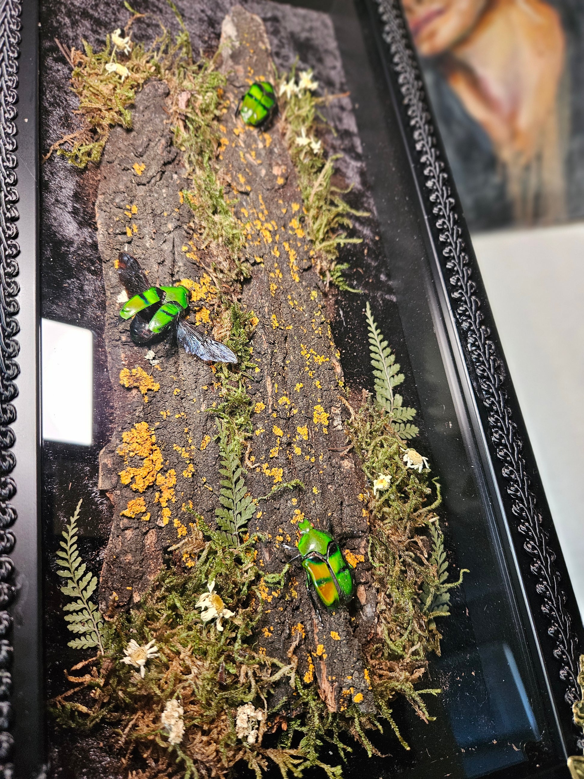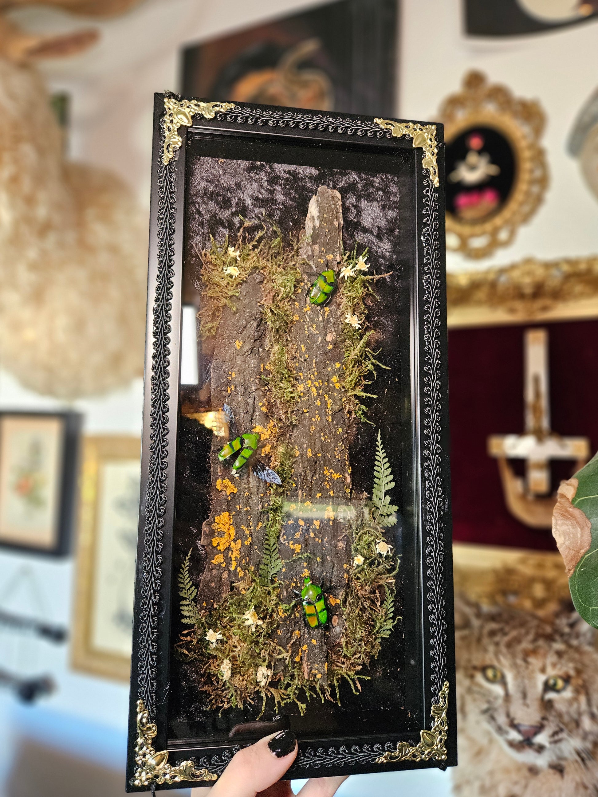 Su9er stunning piece thats hars to capture! 3 shint green flower beetles resting and hiding among lichen cover bark and a fairy garden. Shown in a 9x20 shadowbox with a wall hanger