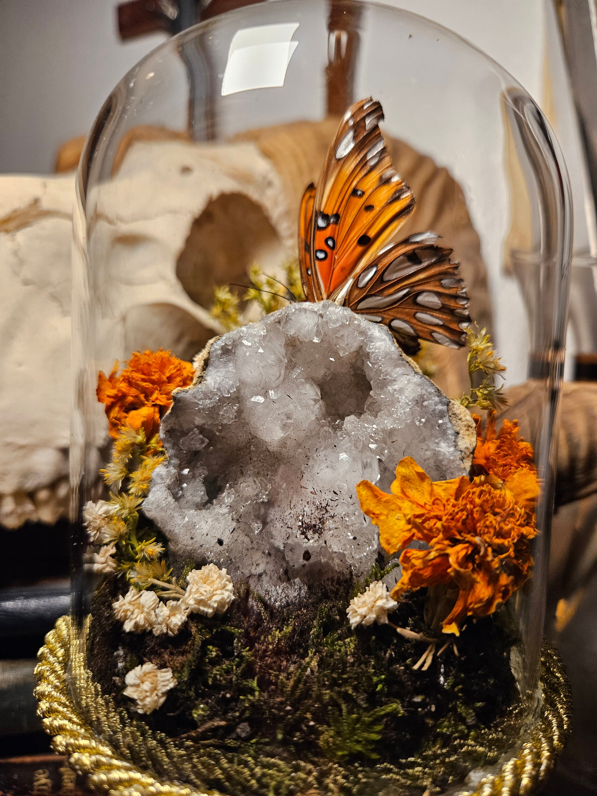 A beautiful natural death gulf fritillary butterfly shown on a geode surrounded orange florals on a vintage brass stand