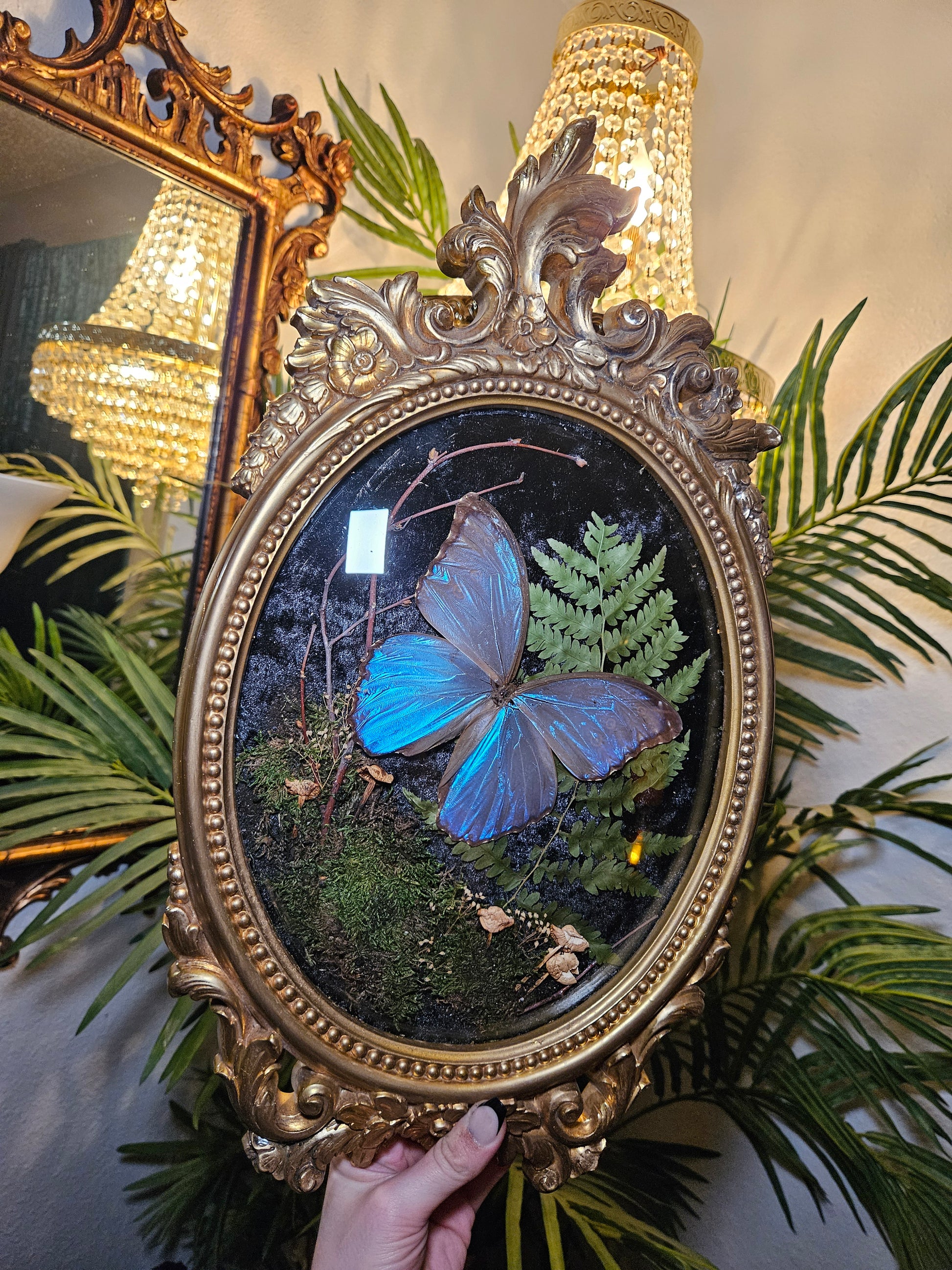 A huge and stunning blue morpho butterfly floating over a nature scene with moss florals and twigs, all shown in a vintage frame, wall hanger