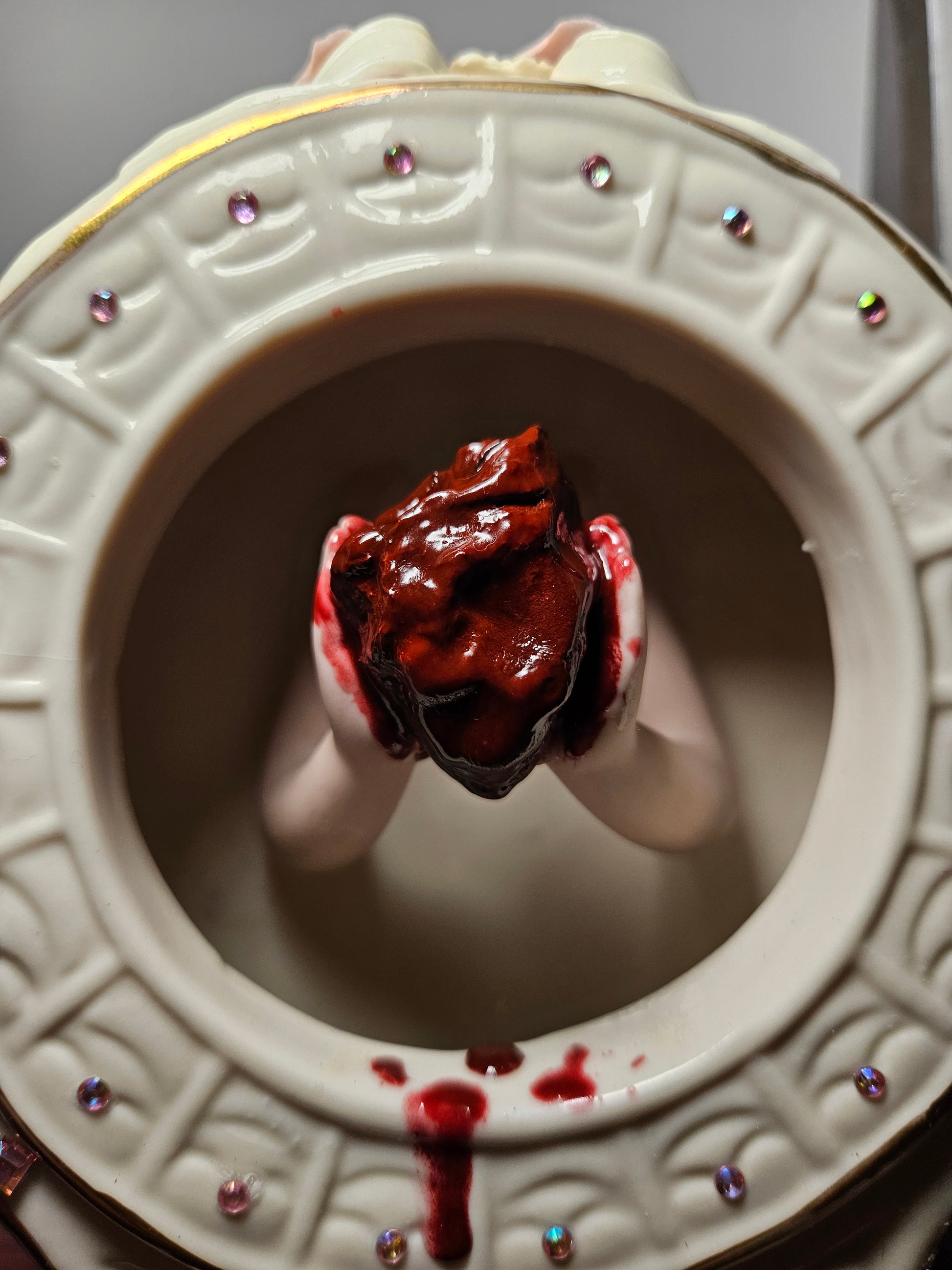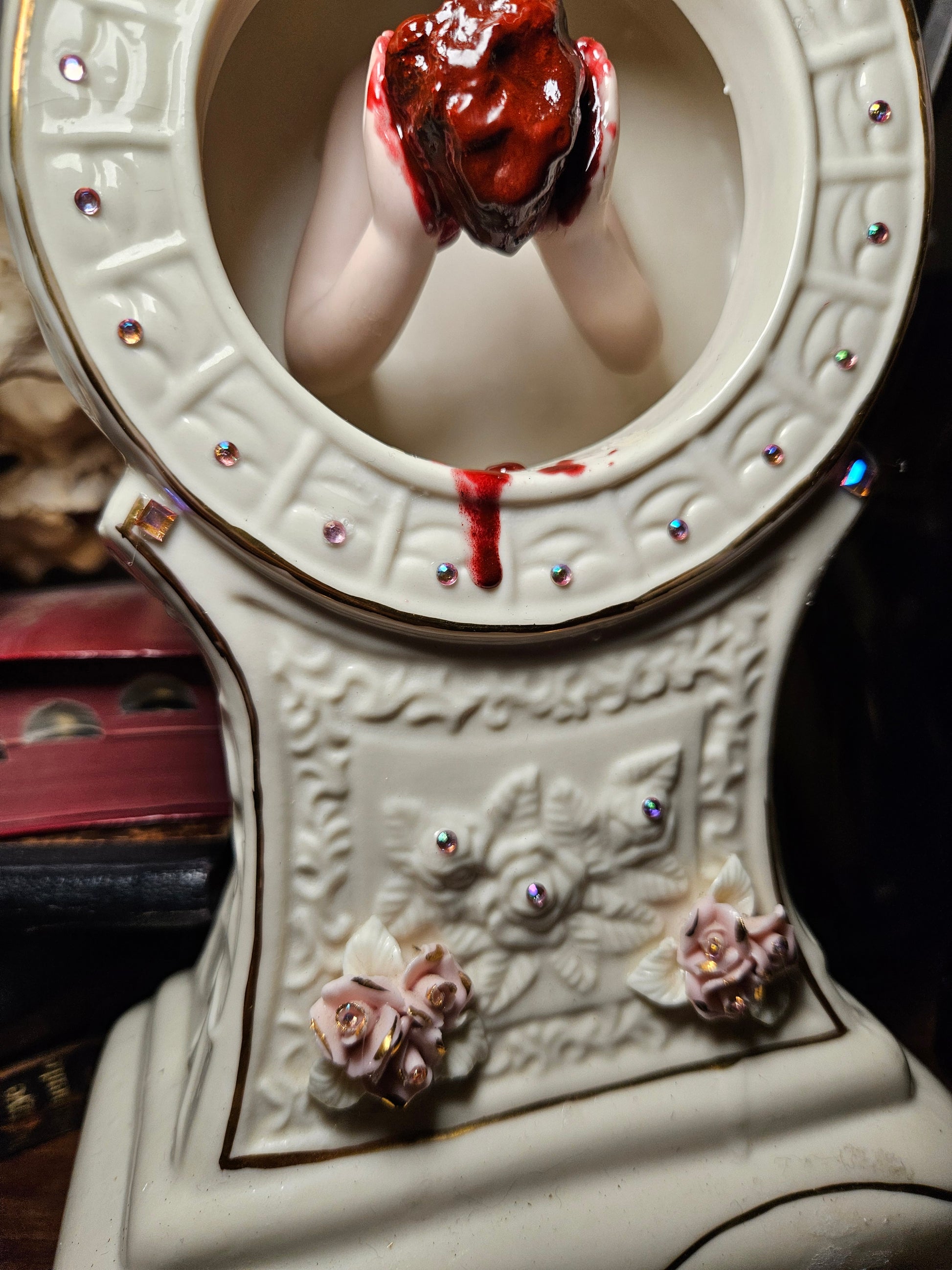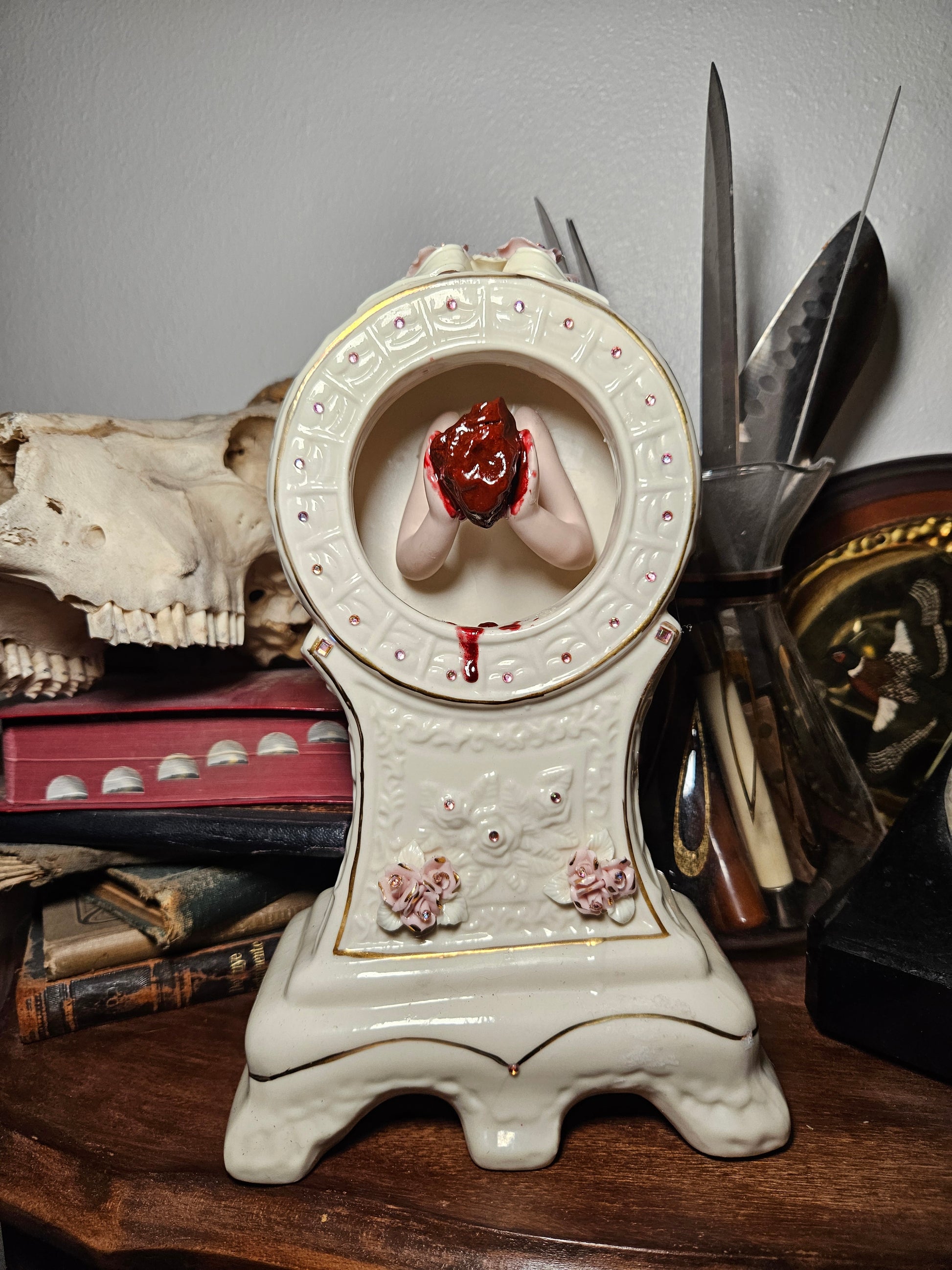 This is a real preserved heart that has been cured in resin. Displayed rested between the hands of a porcelain doll. Highlighted by the gorgeous vintage ceramic clock with rhinestones accents