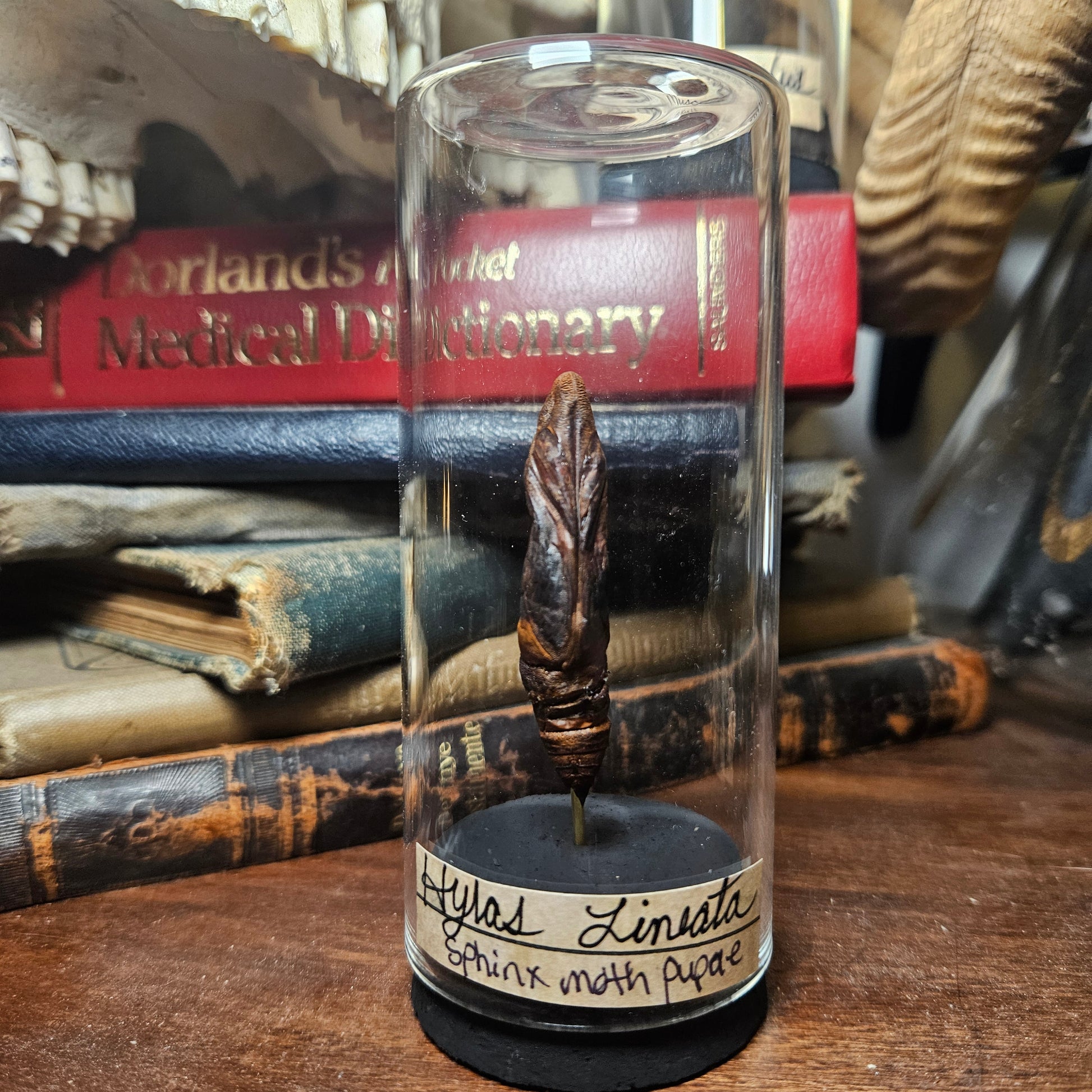 A dried and mummified hylas lineata pupae. This is a white lined sphinx moth coccoon that failed to emerge this summer. Shown in a glass dome with a hand written antique specimen style label