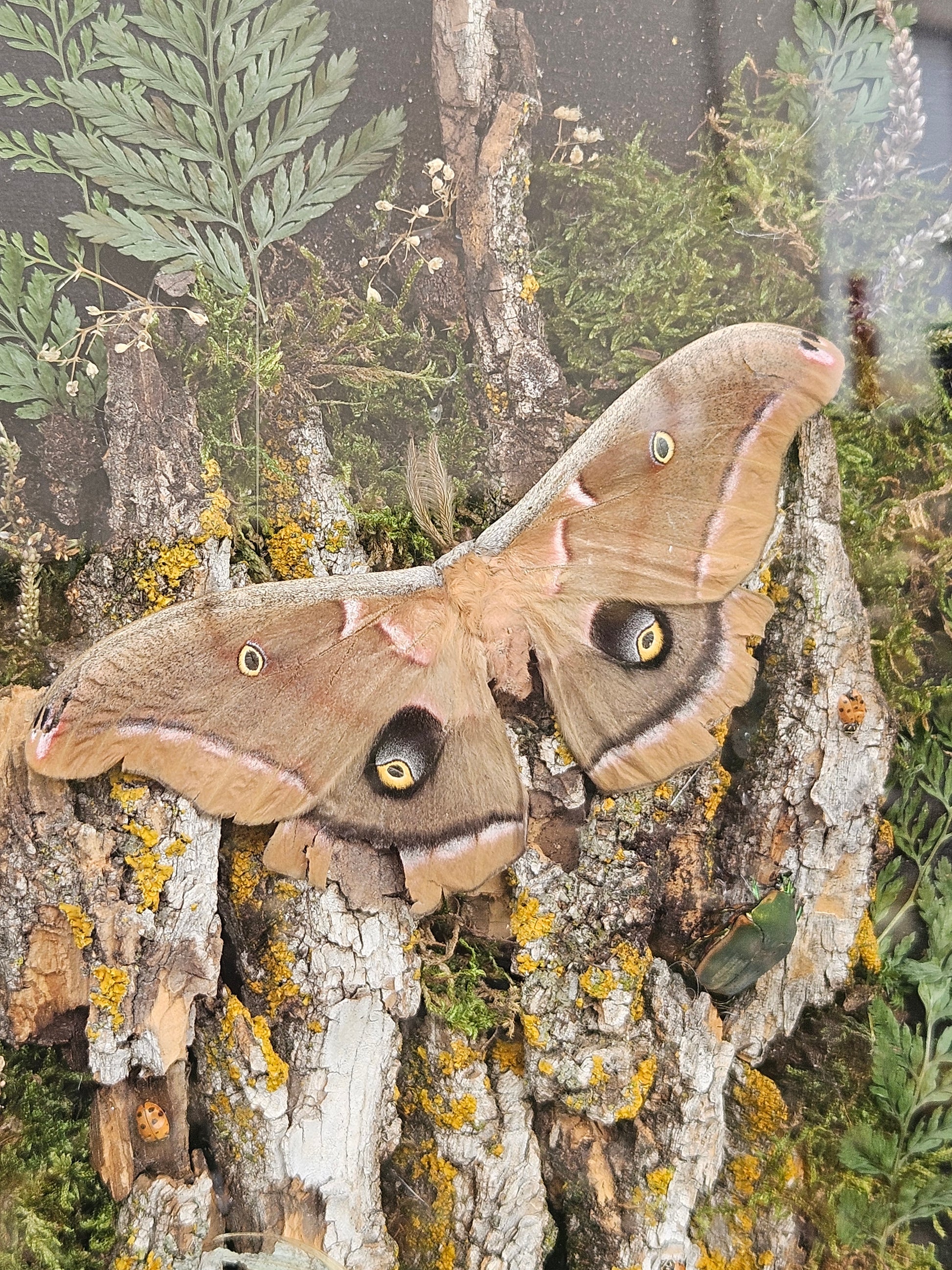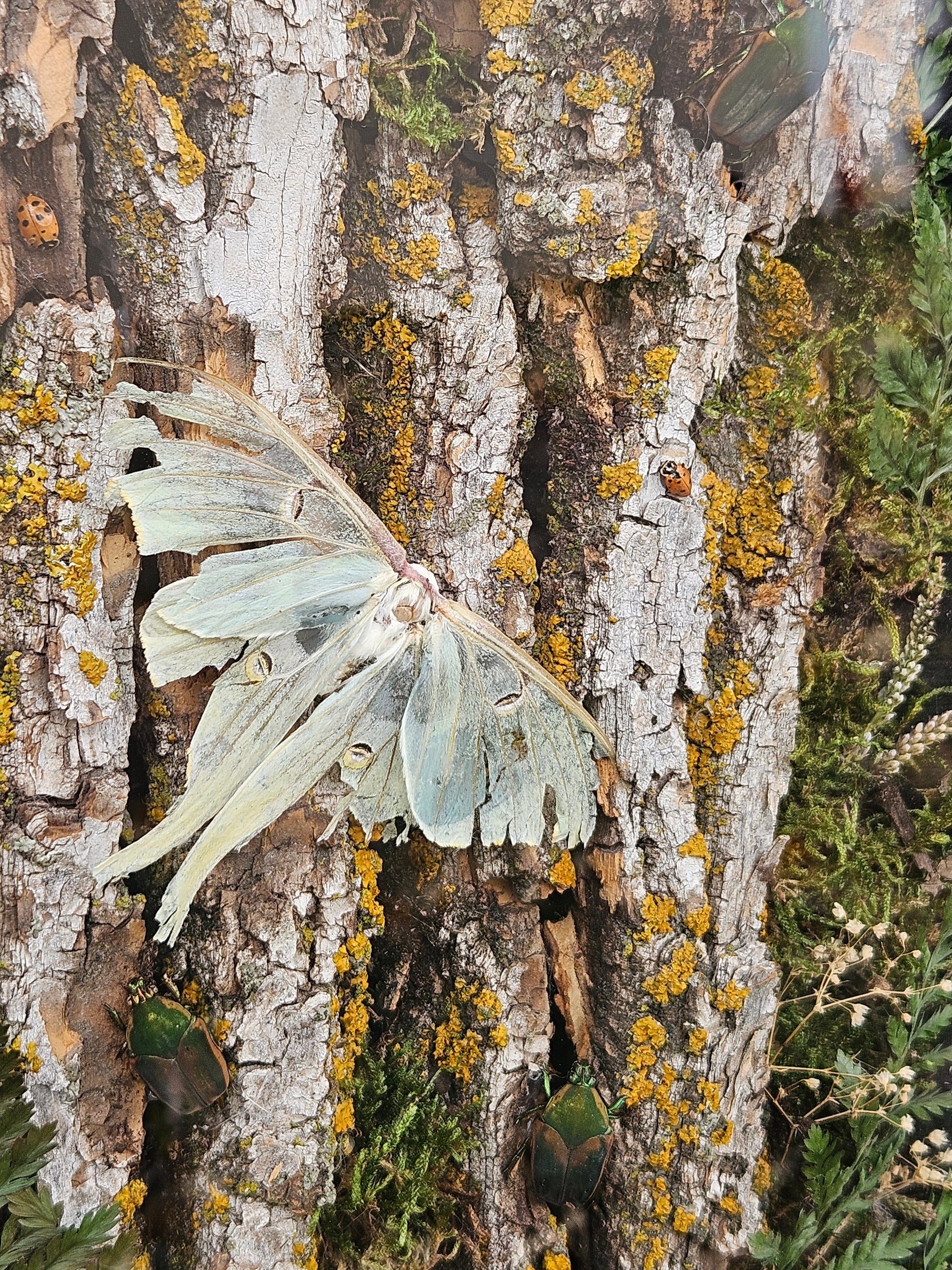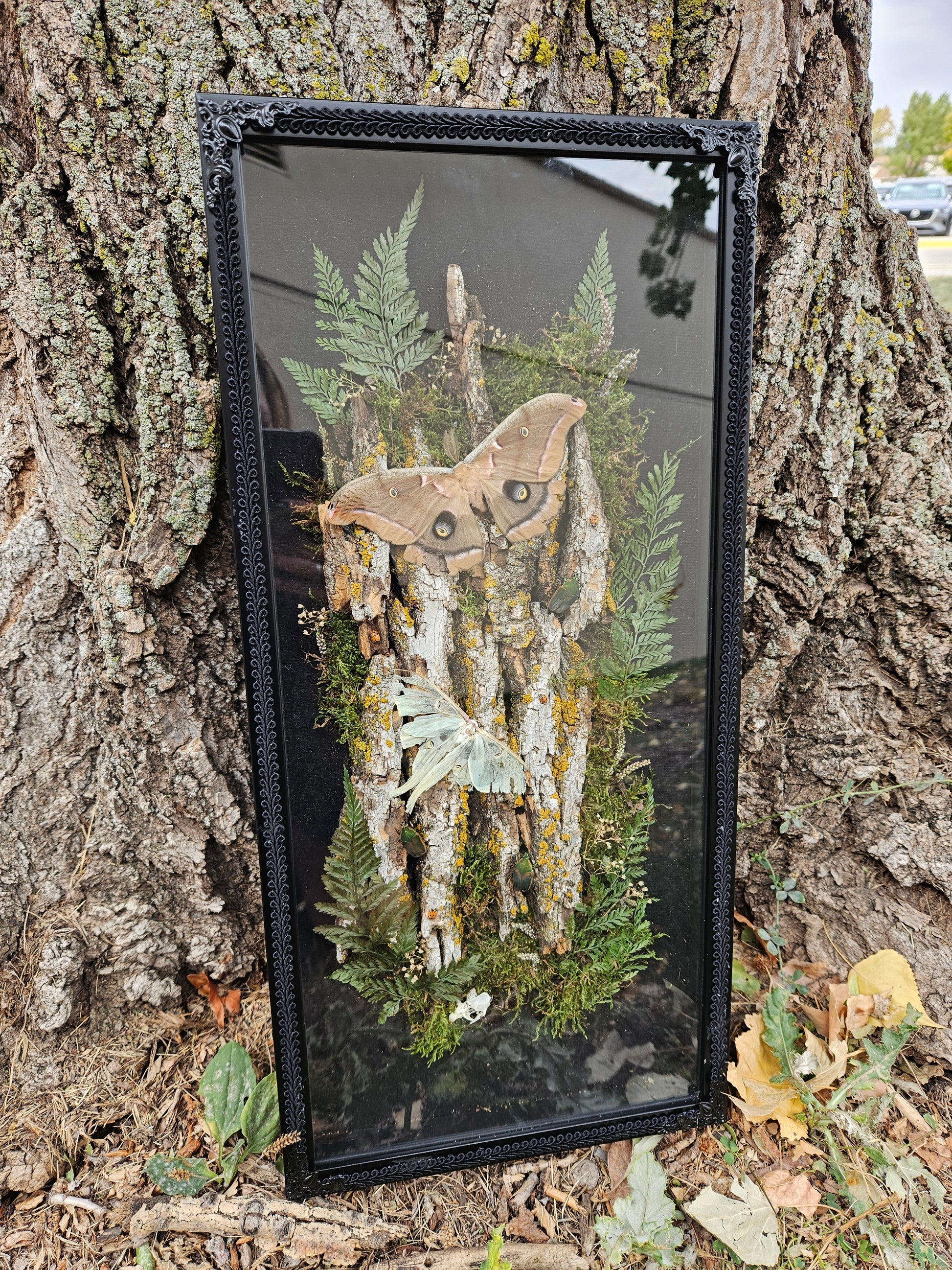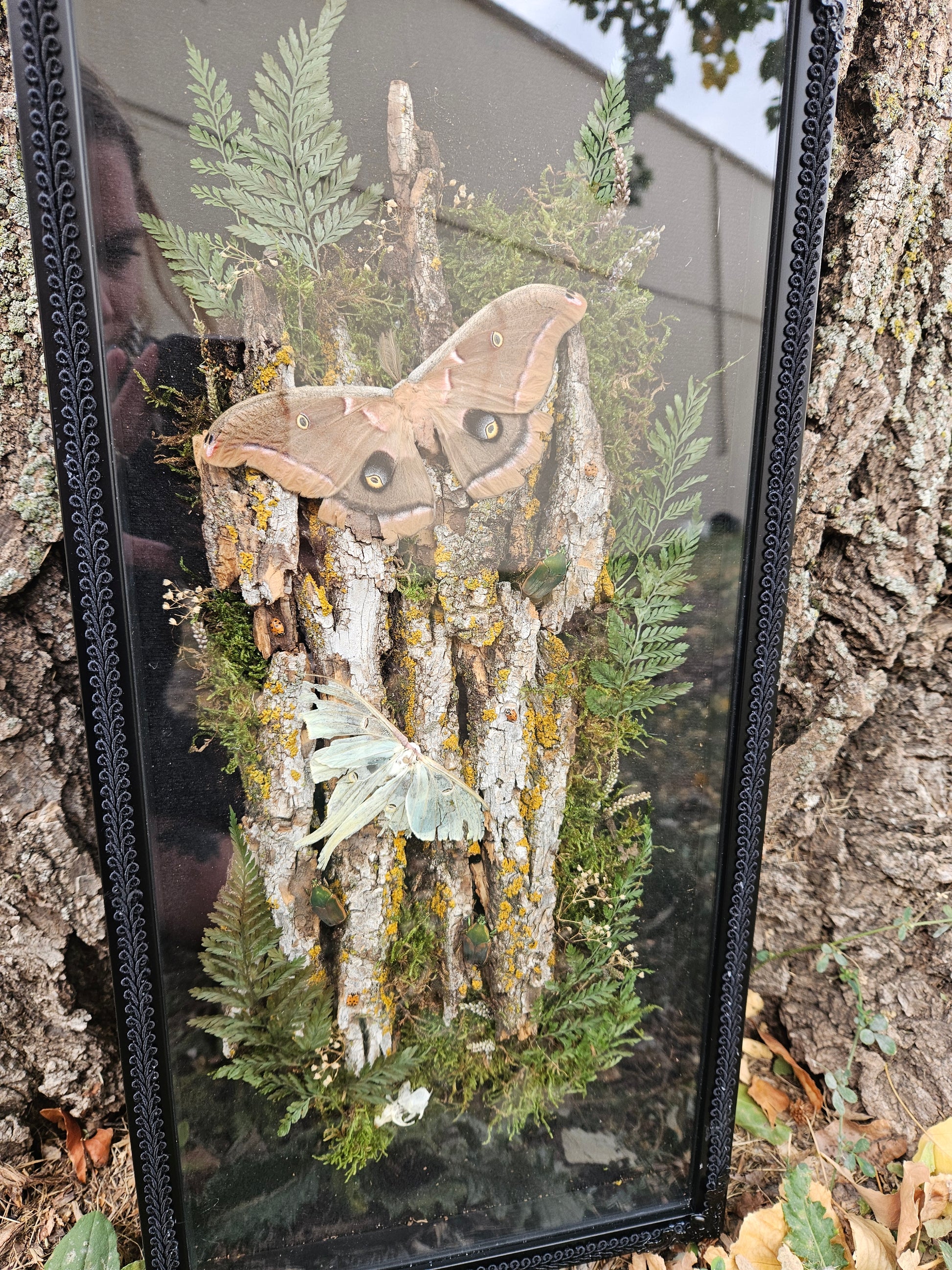 A gorgeous collection of north america species including a luna moth, polyphemous moth, ladybugs a doll June beetles. Shown on breathing lichen covered wood from a cemetery all in a shadowbox. This is big and will not be cheap to ship.