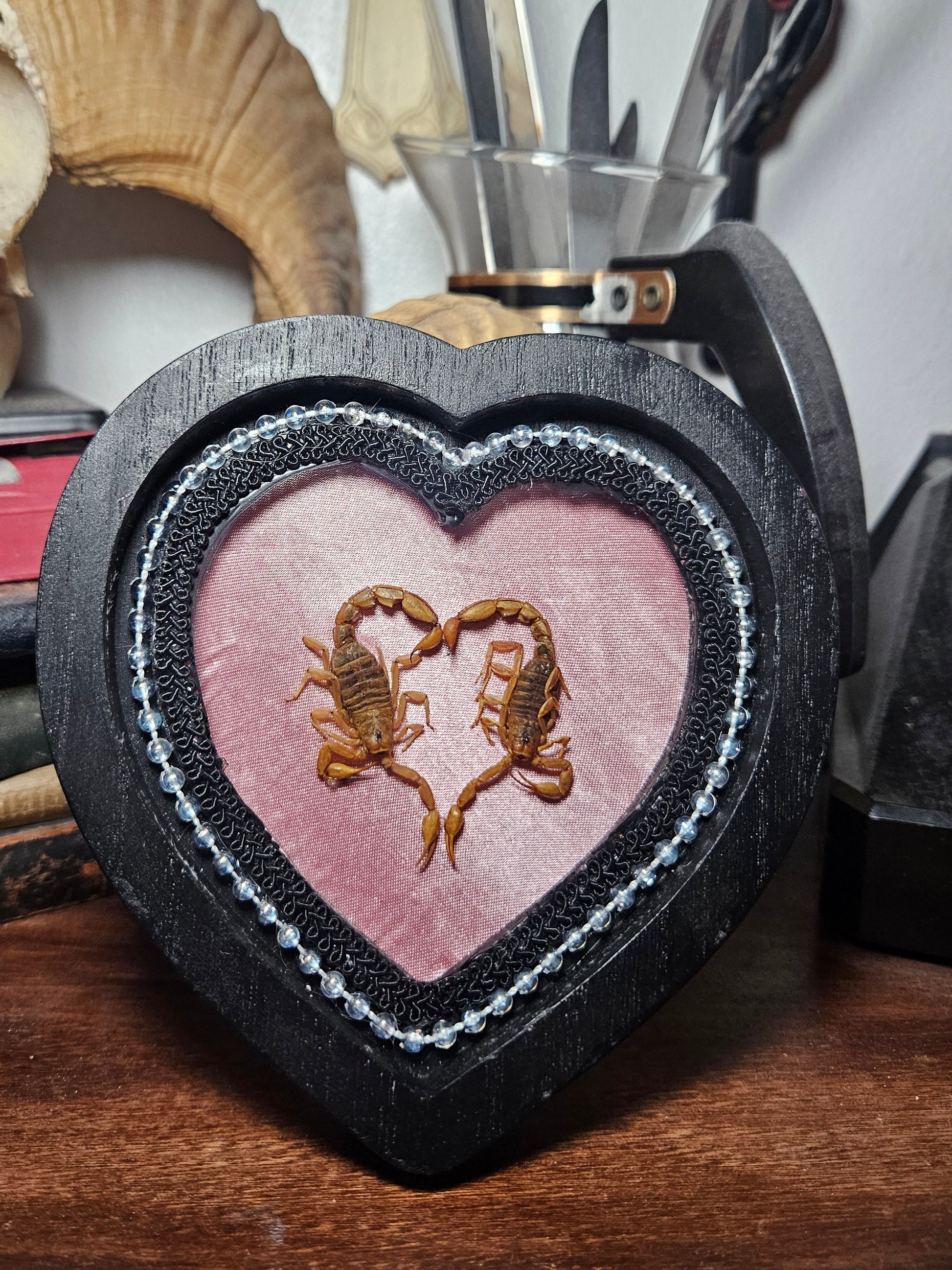 A gorgeous pair or scorpions from an American breeder shown in a heart shaped frame, easel back
