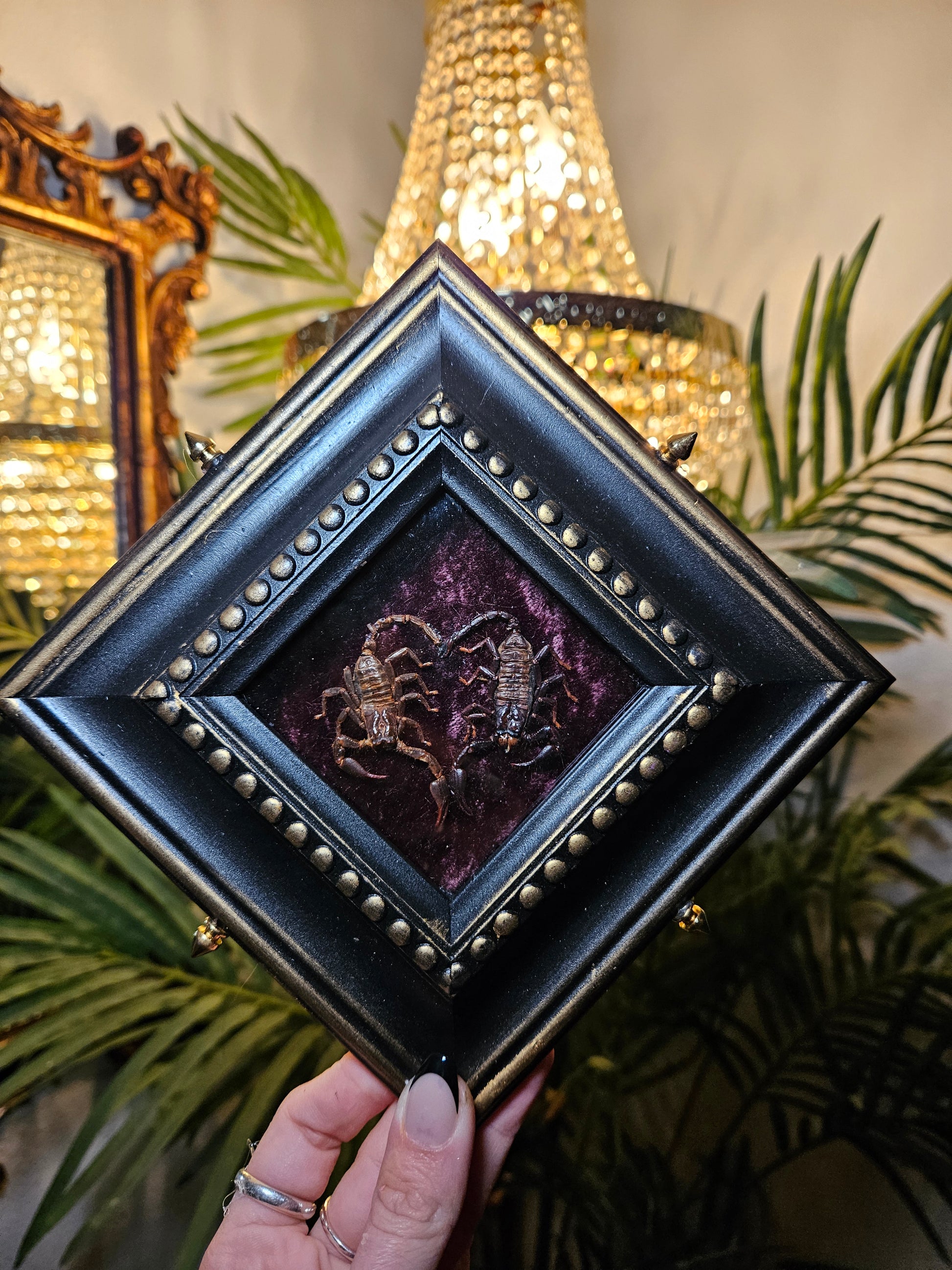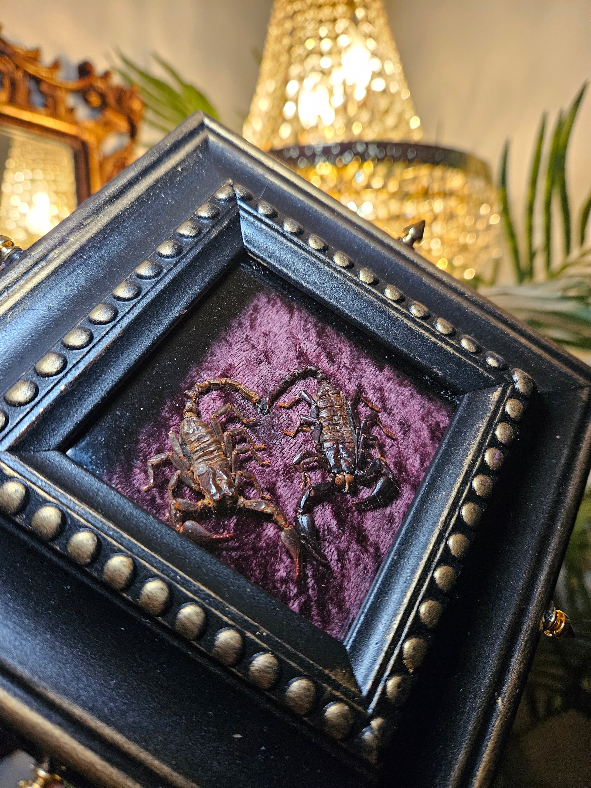 An adorable pair of scorpion lovers in a shadowbox frame with spikes!! This is a wall hanger piece