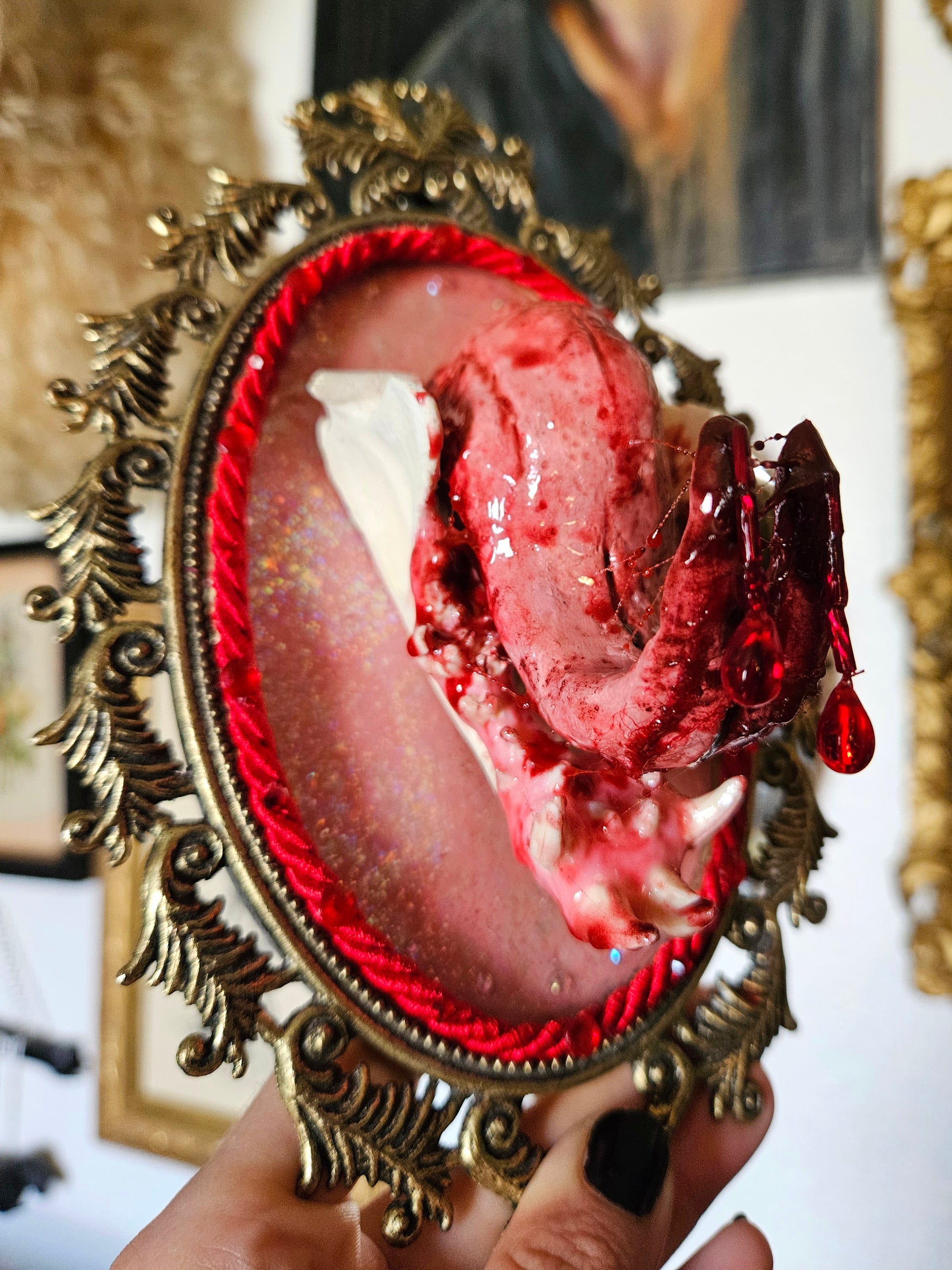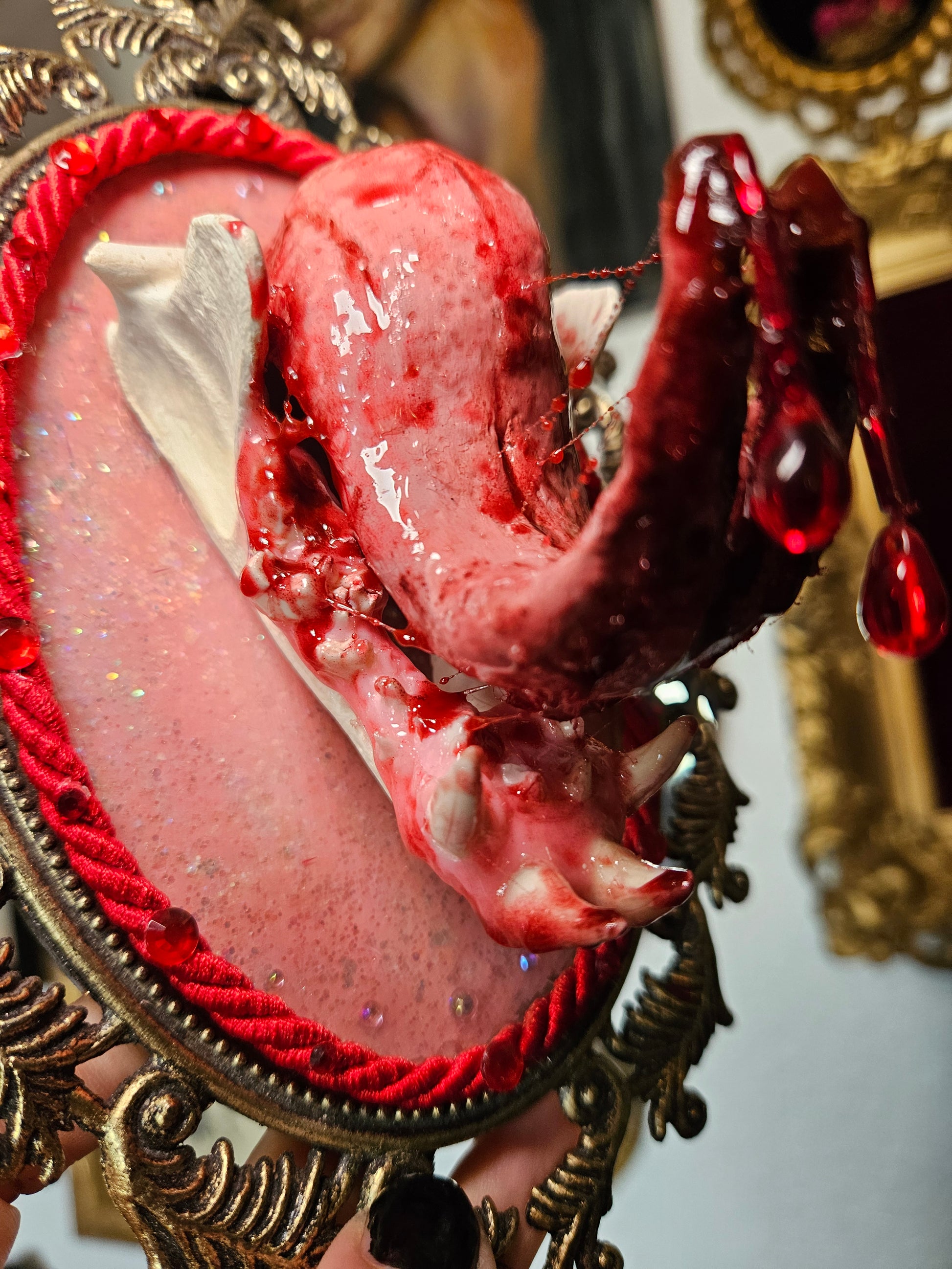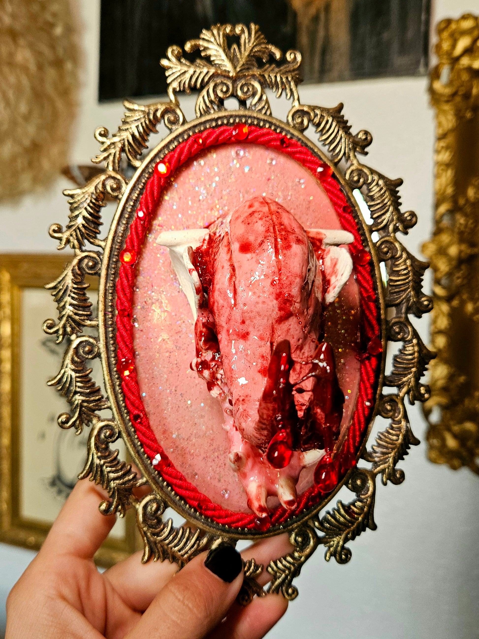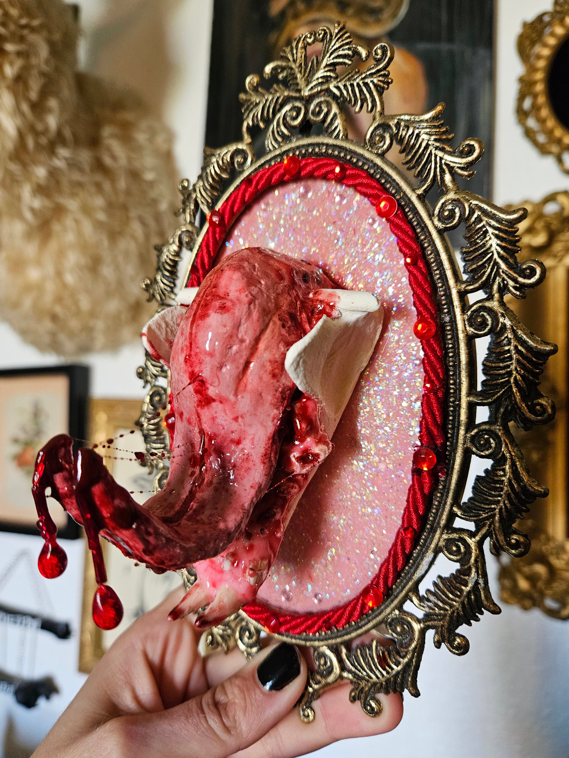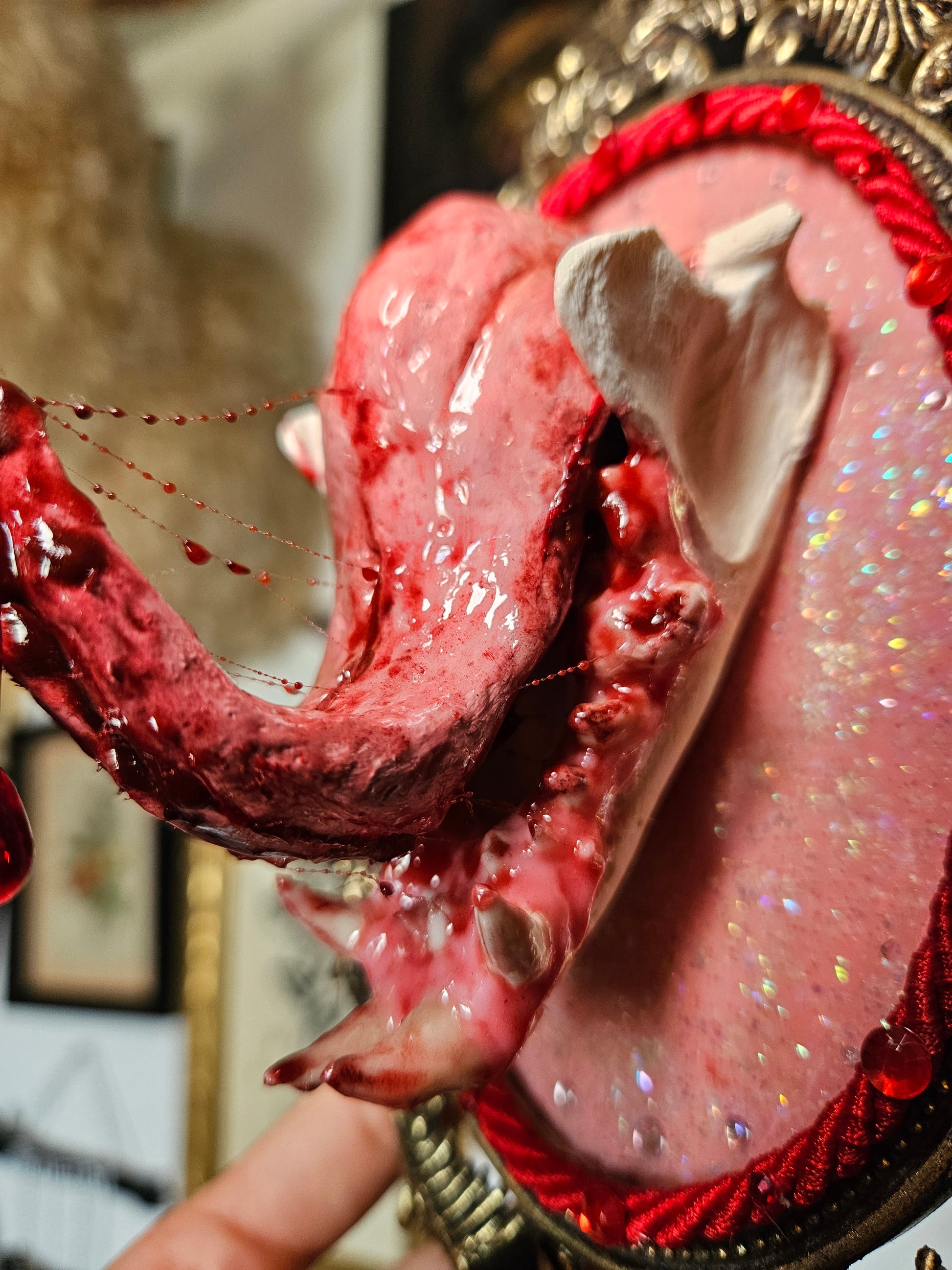 Epoxy & mixed media sculpture with real jaw and glitter background in a vintage frame.