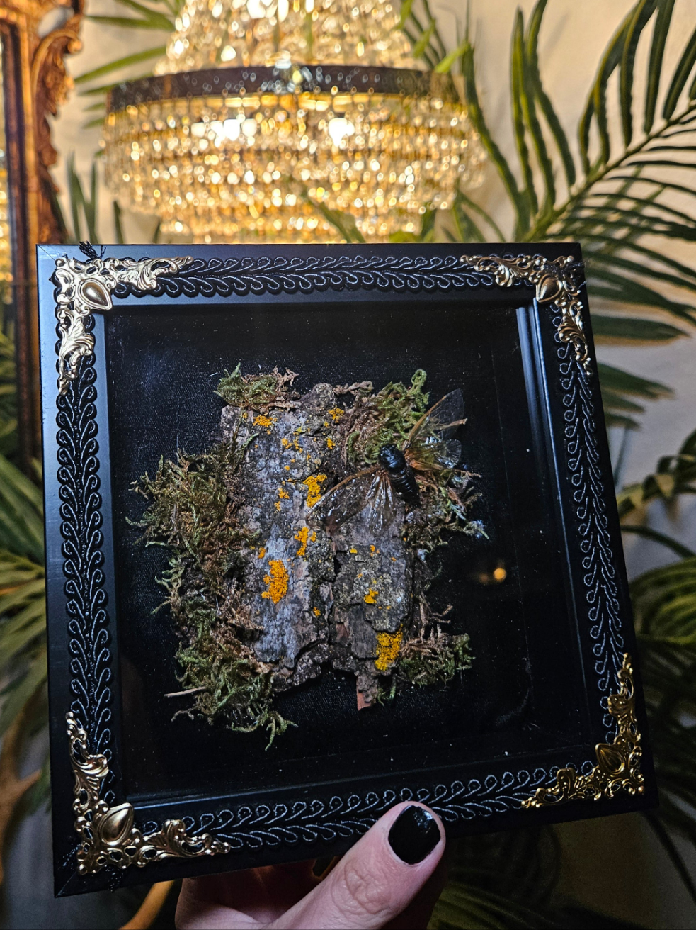 A periodical cicada camoflauged upon lichen cover wood with a forest scene. Shadow box wall hanger