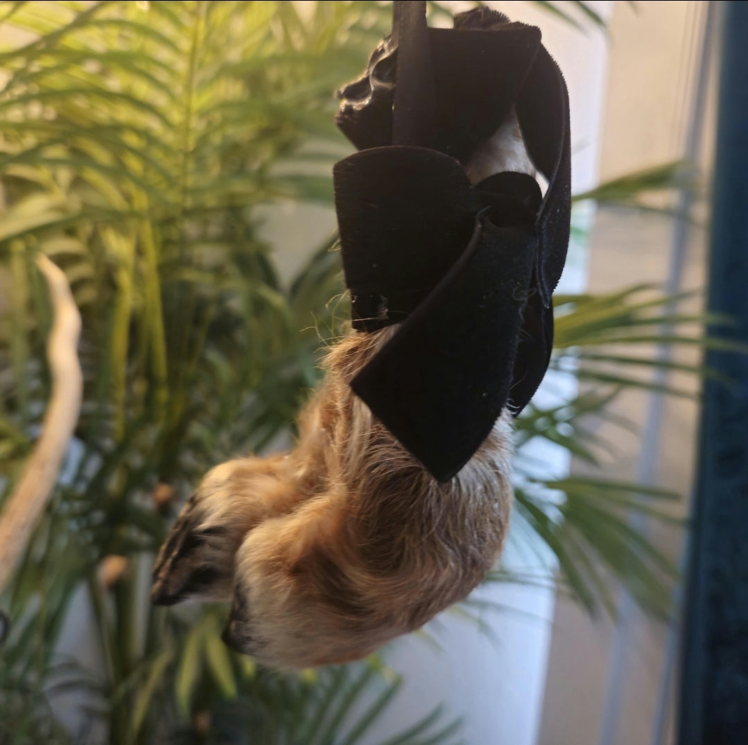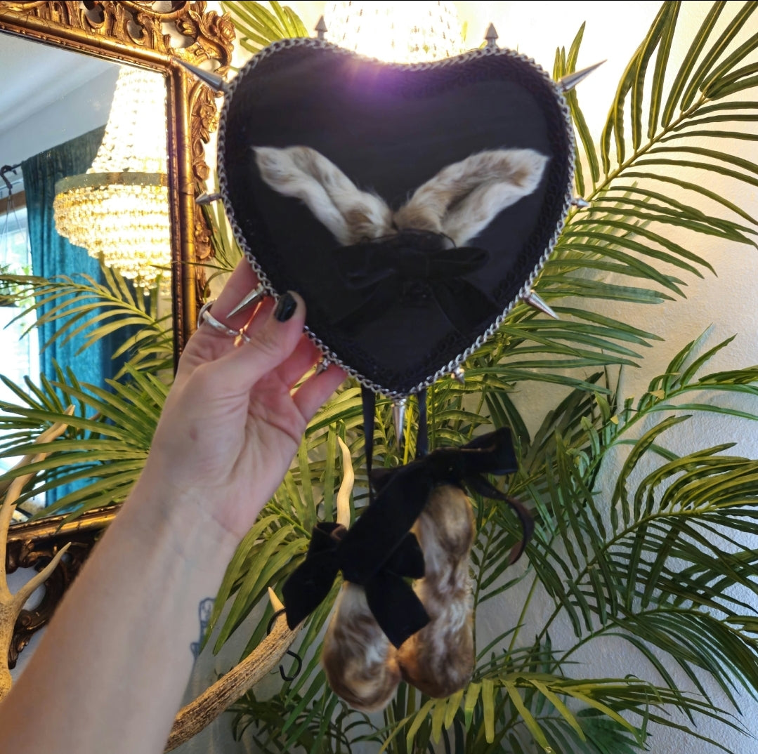 Cute and delicate pair or matching lamb ears and slippers (legs) shown on a wooden heart plaque adorned with velvet and spikes. This is a wall hanger.