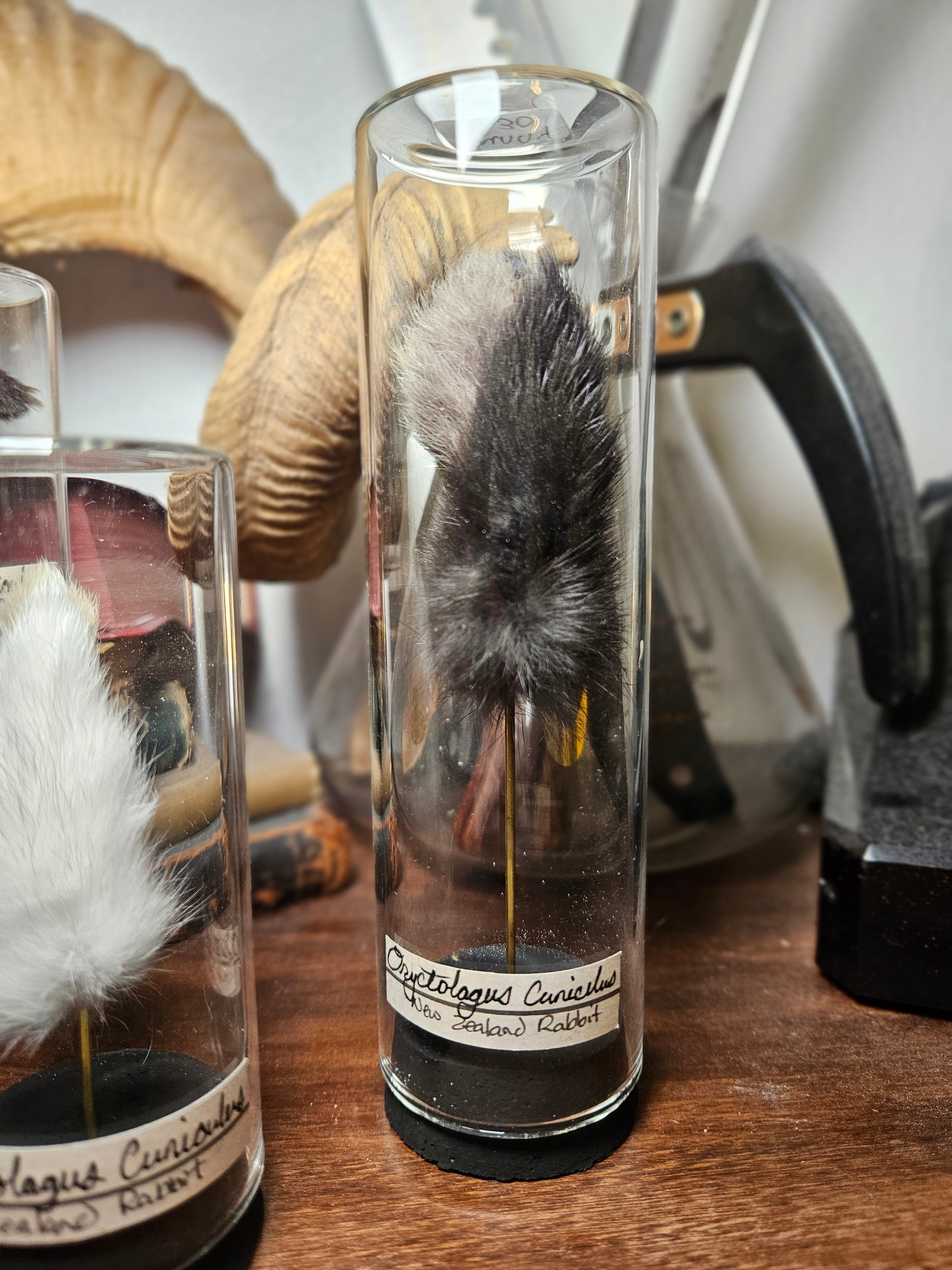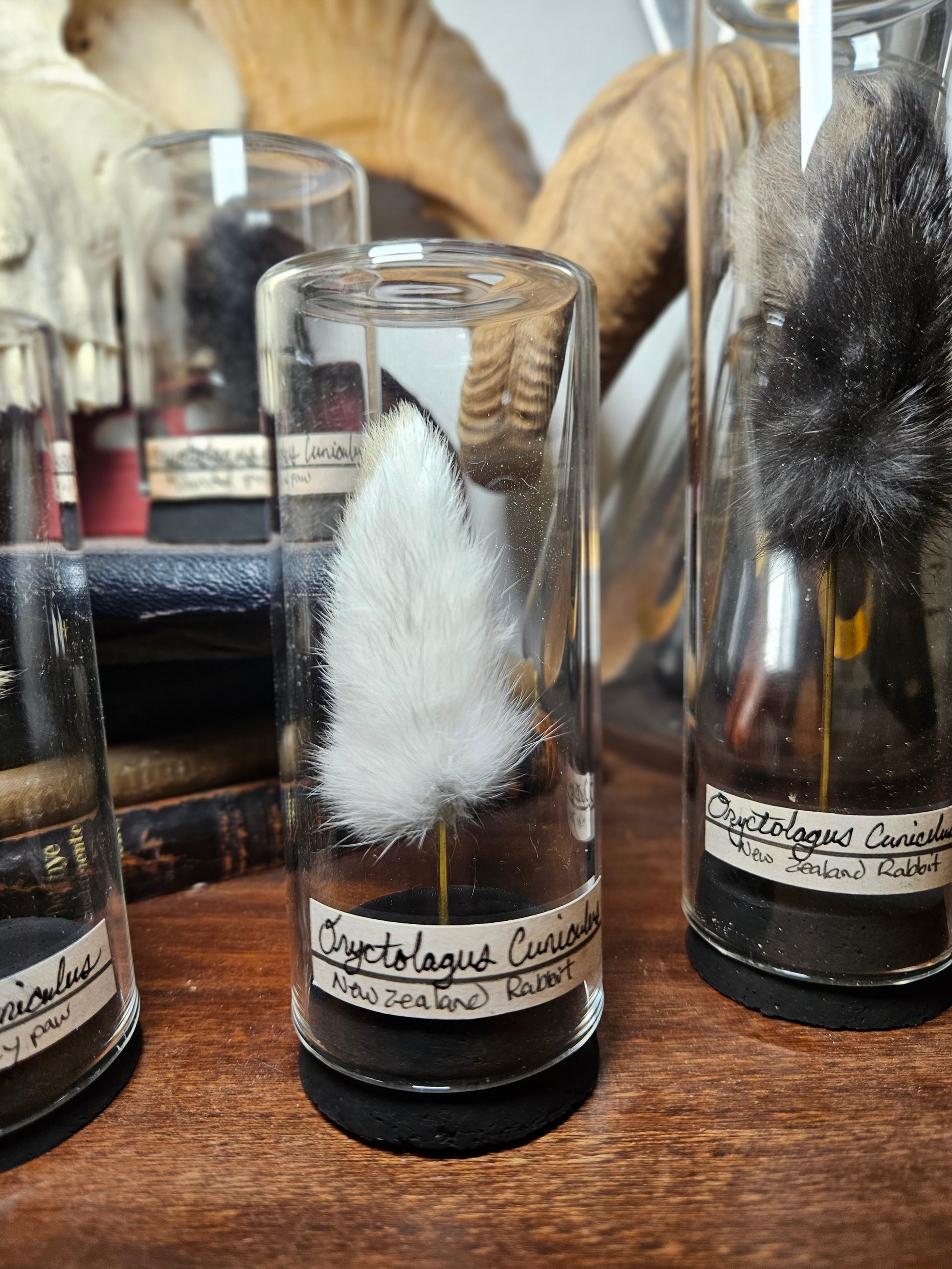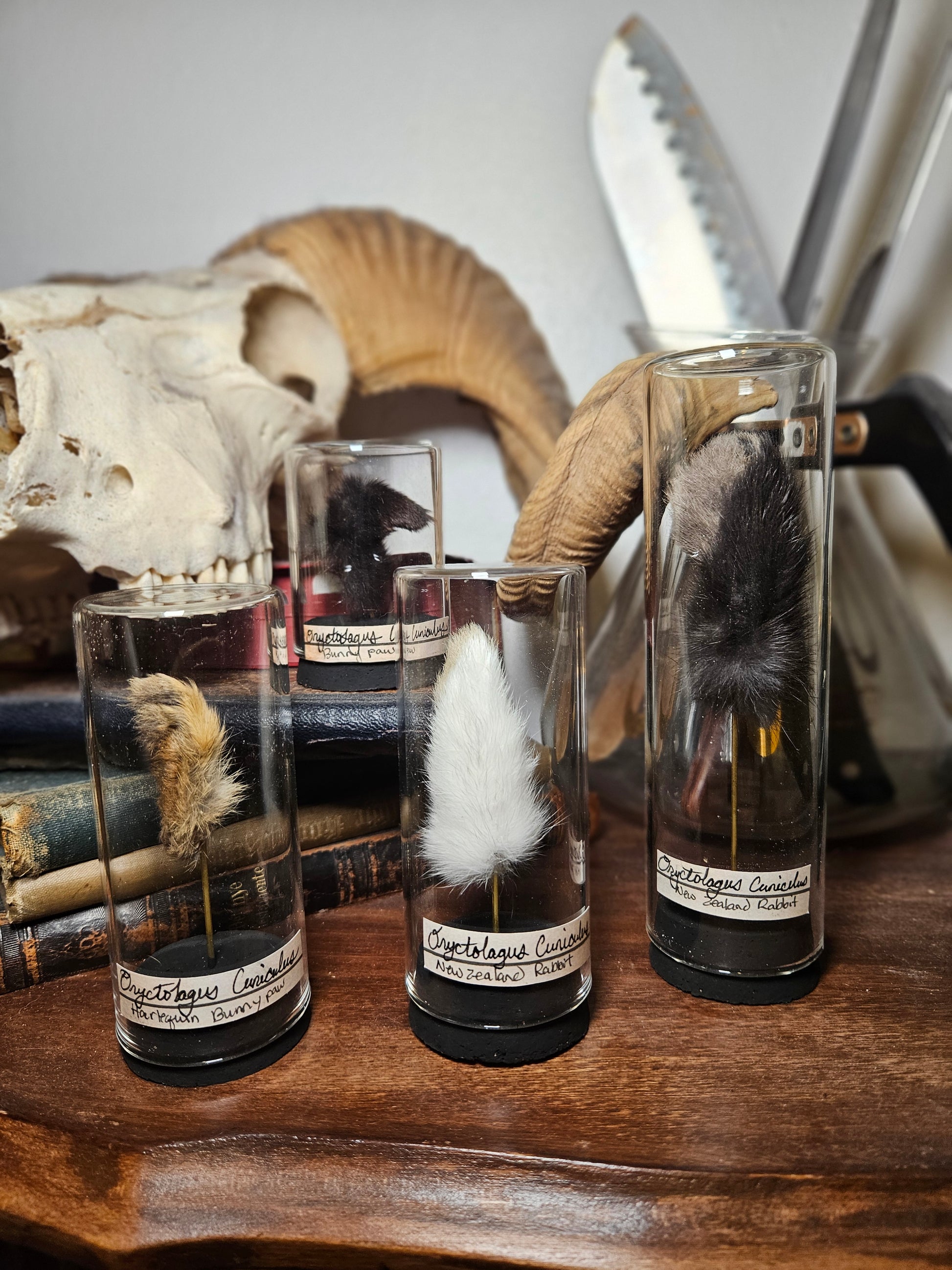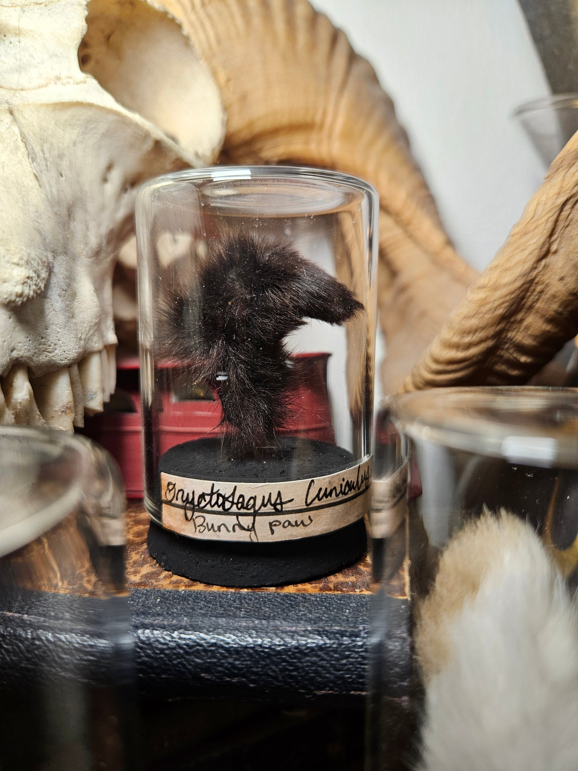 Various mummified rabbit feet, shown in a antique style glass curio