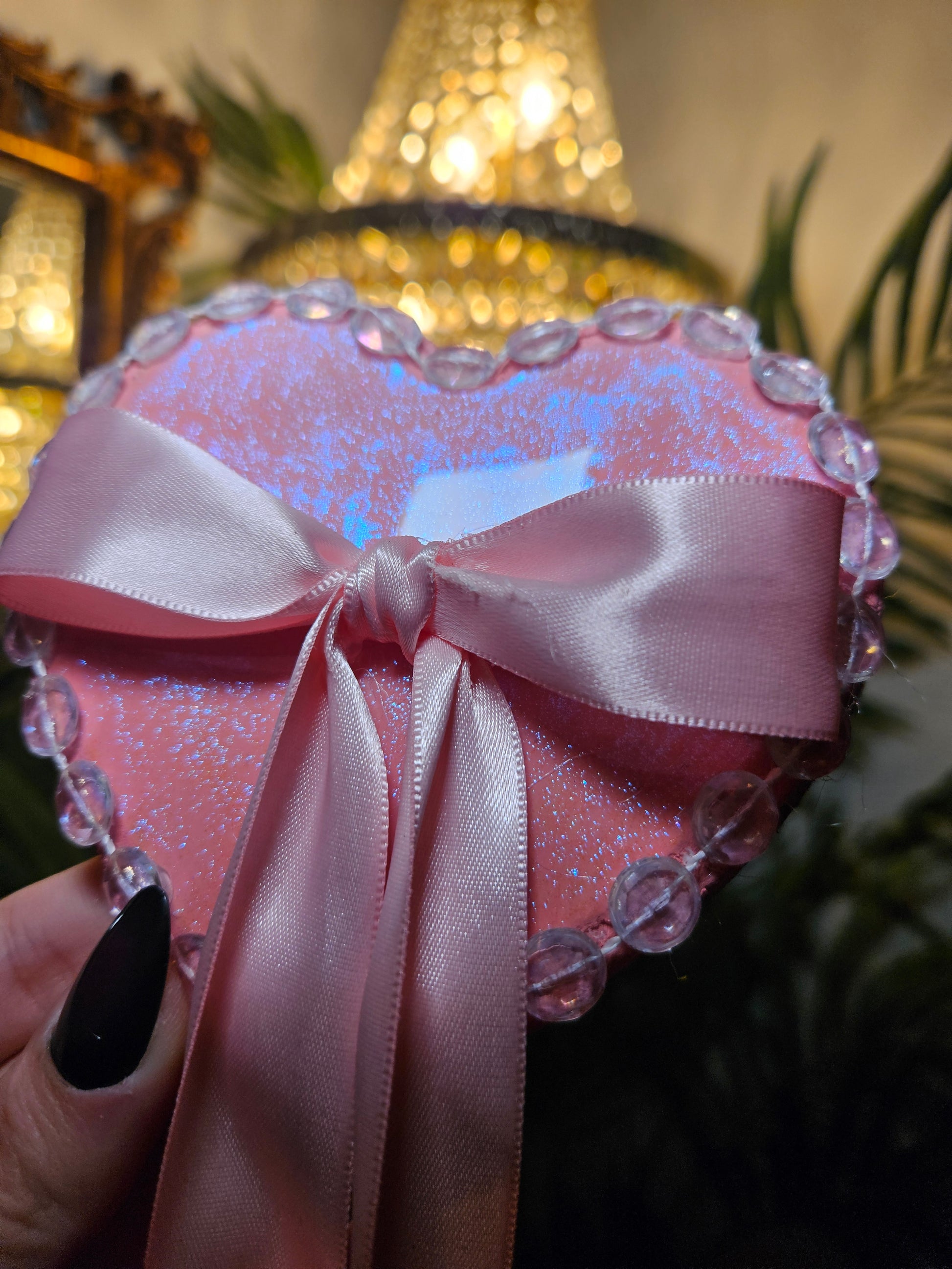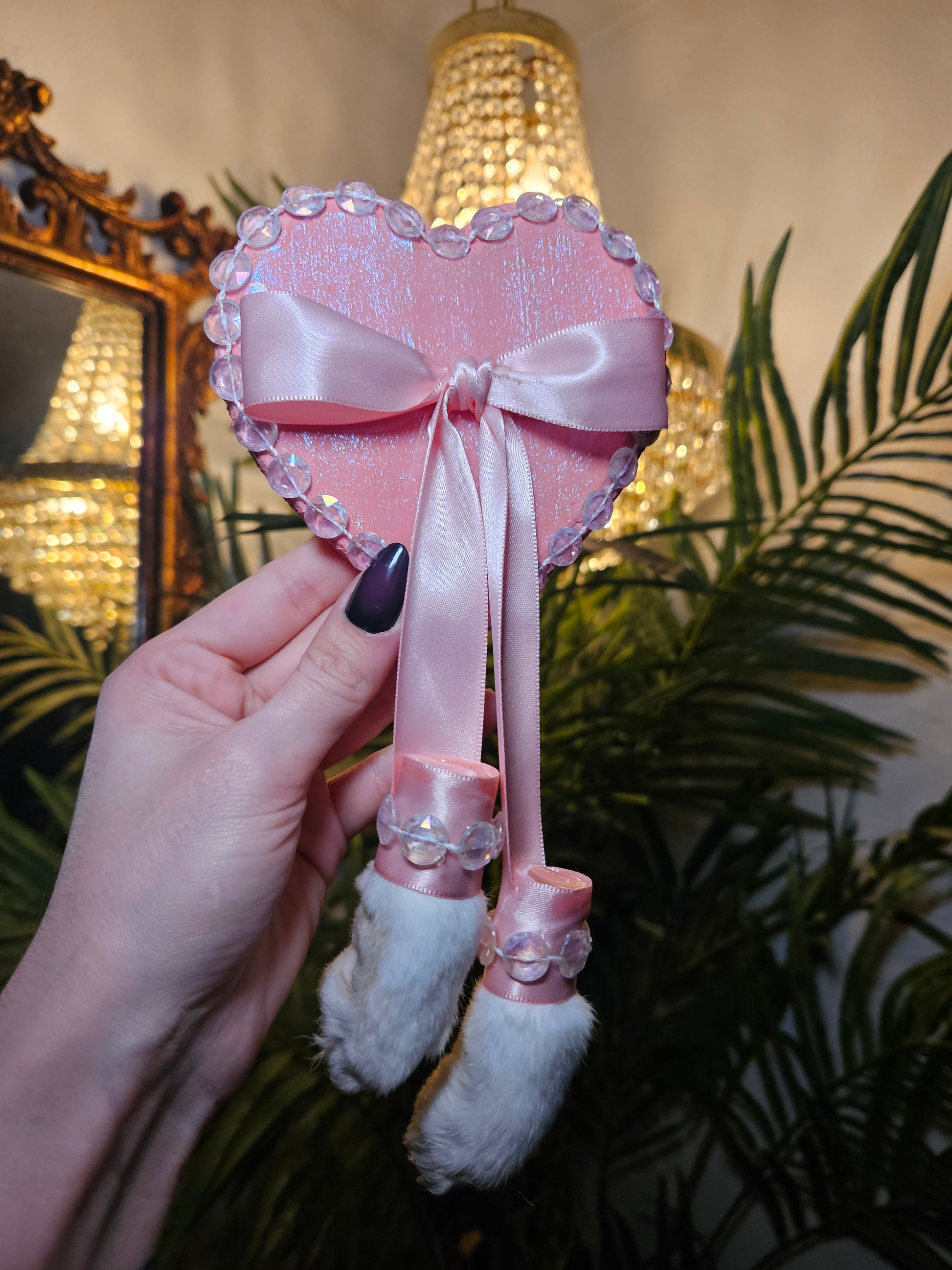 An adorable pair of mathicng rabbit feet shown and ballerina slippers hanging from a bow on a glittering heart shaped plaque, wall hanger
