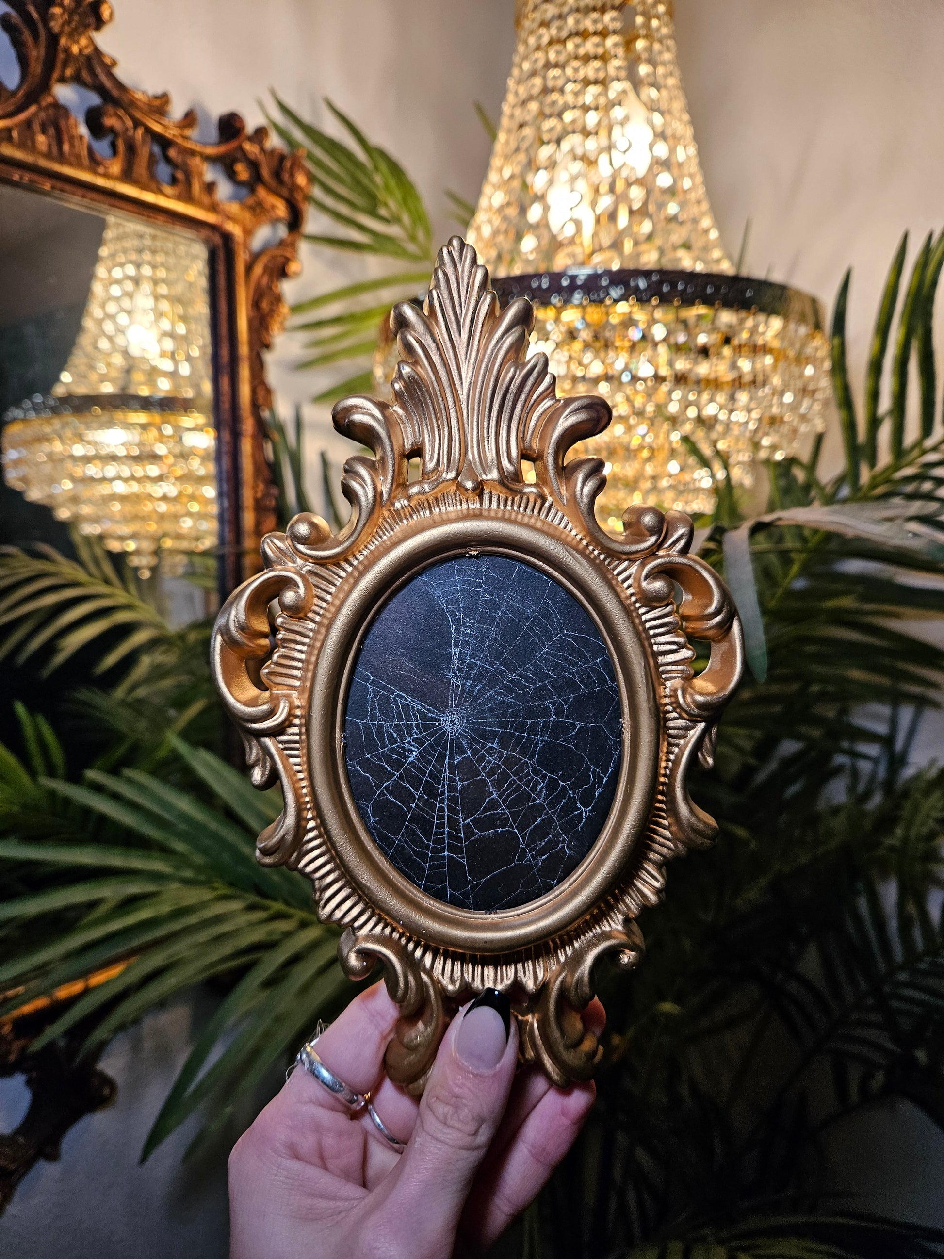 A real captured spider web, preserved and displayed in a vintage frame. This is a wall hanger.