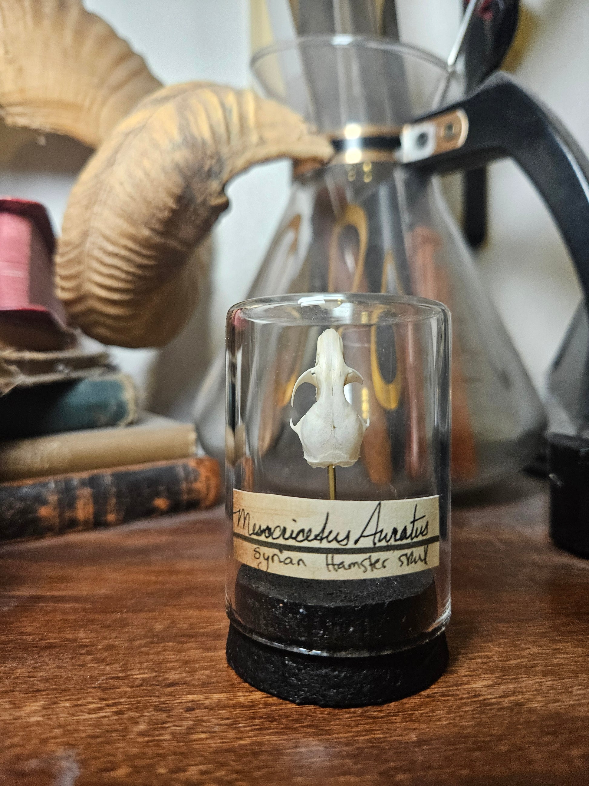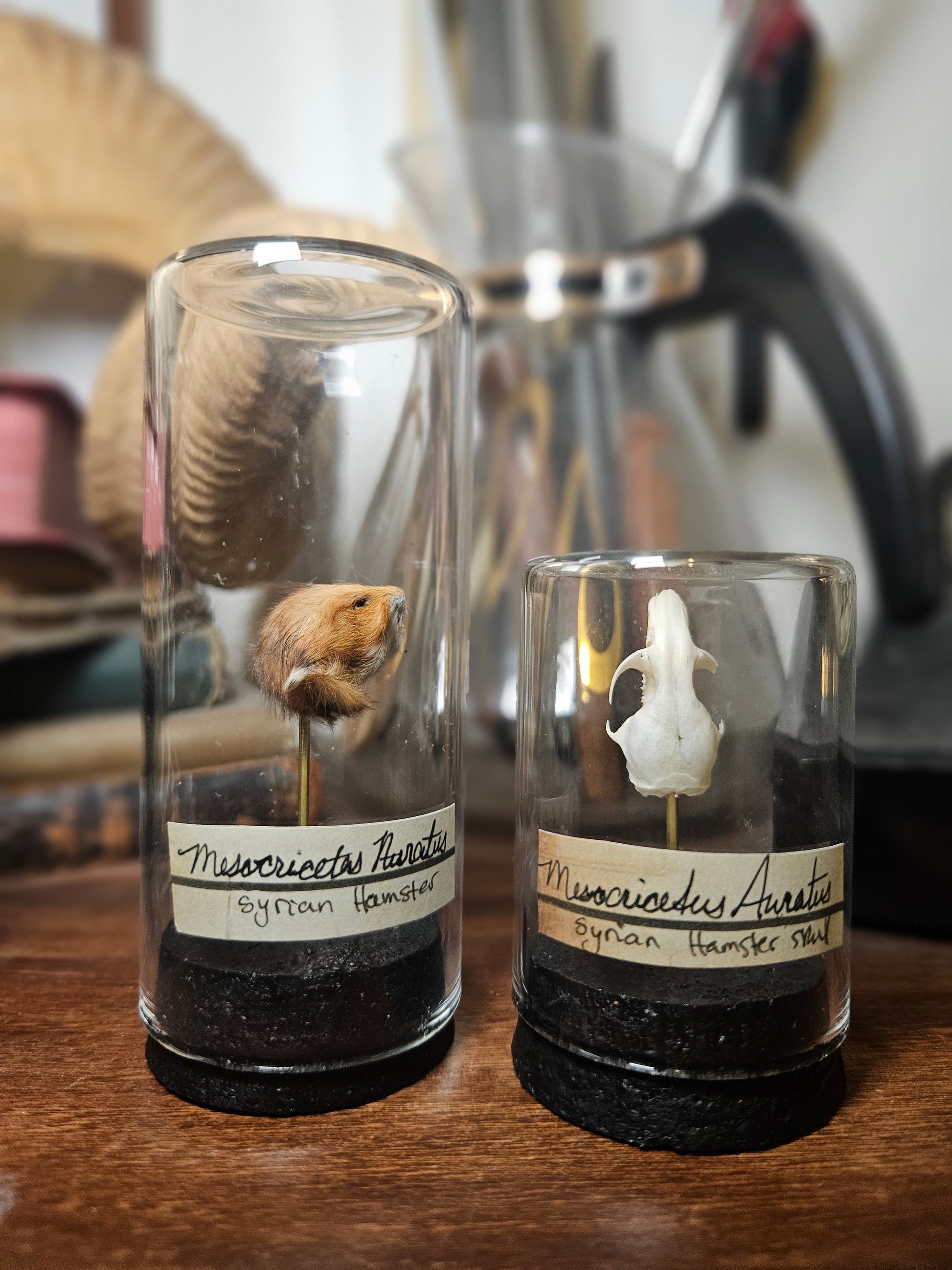Real mummified baby hamster & hamster skull shown in glass domes with an antique style label