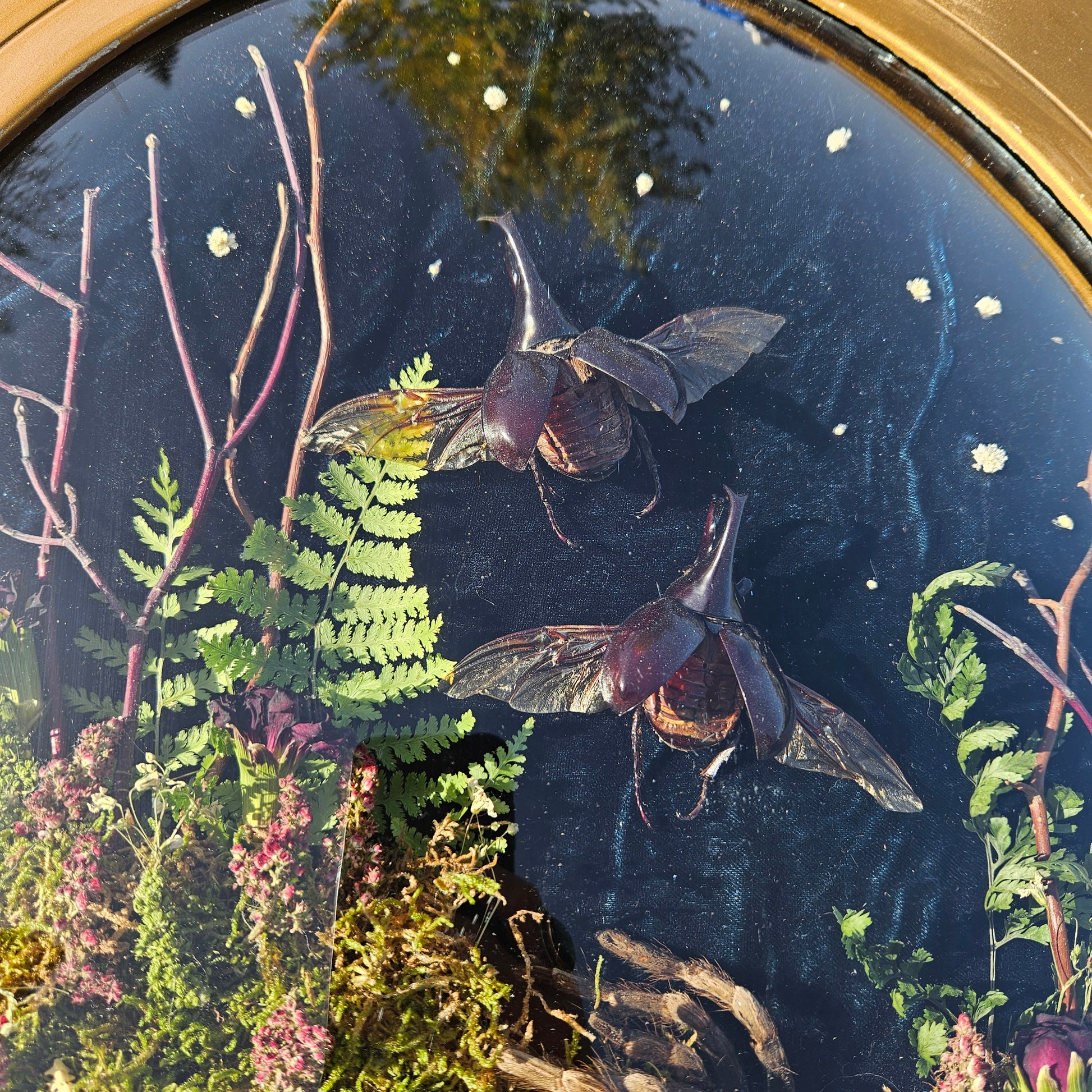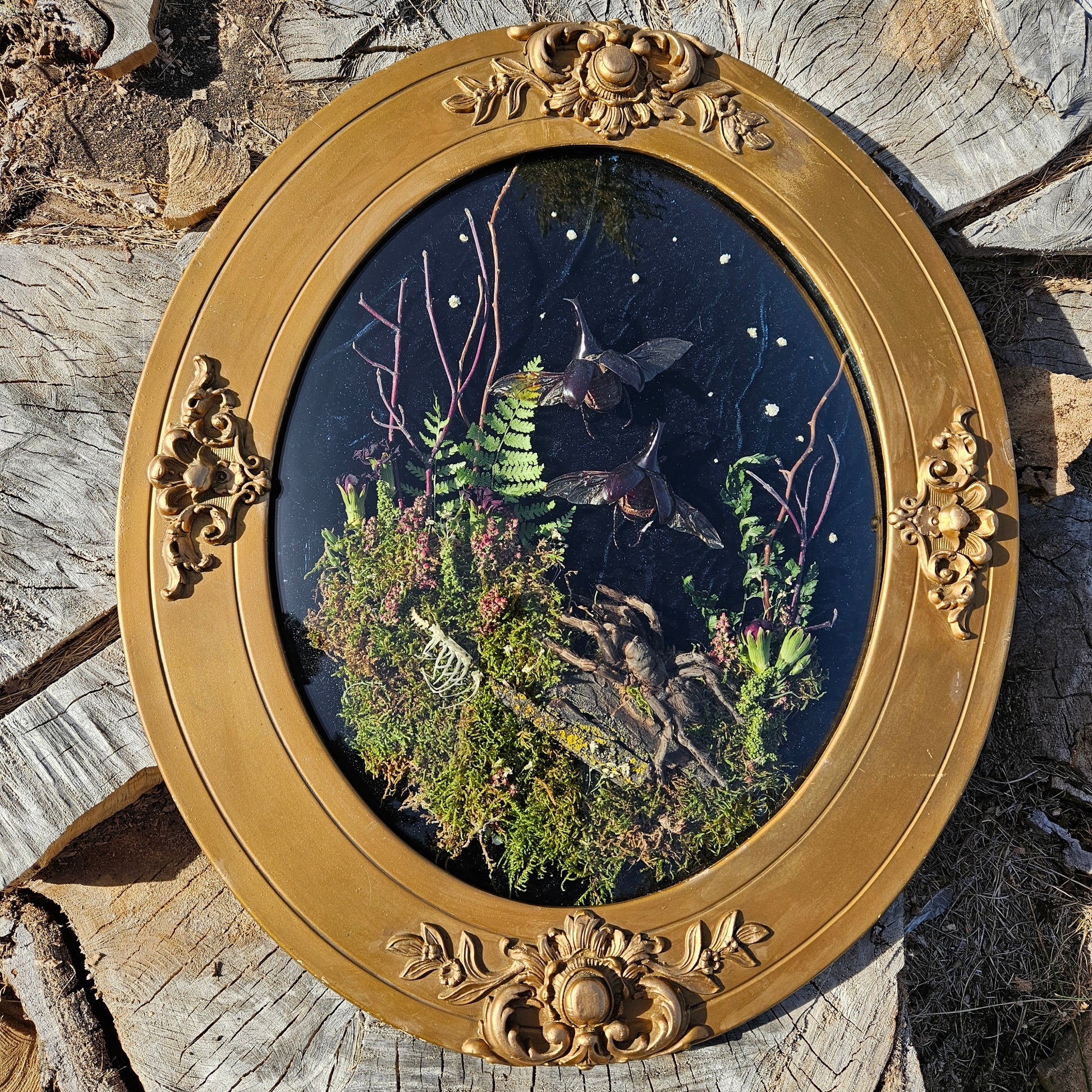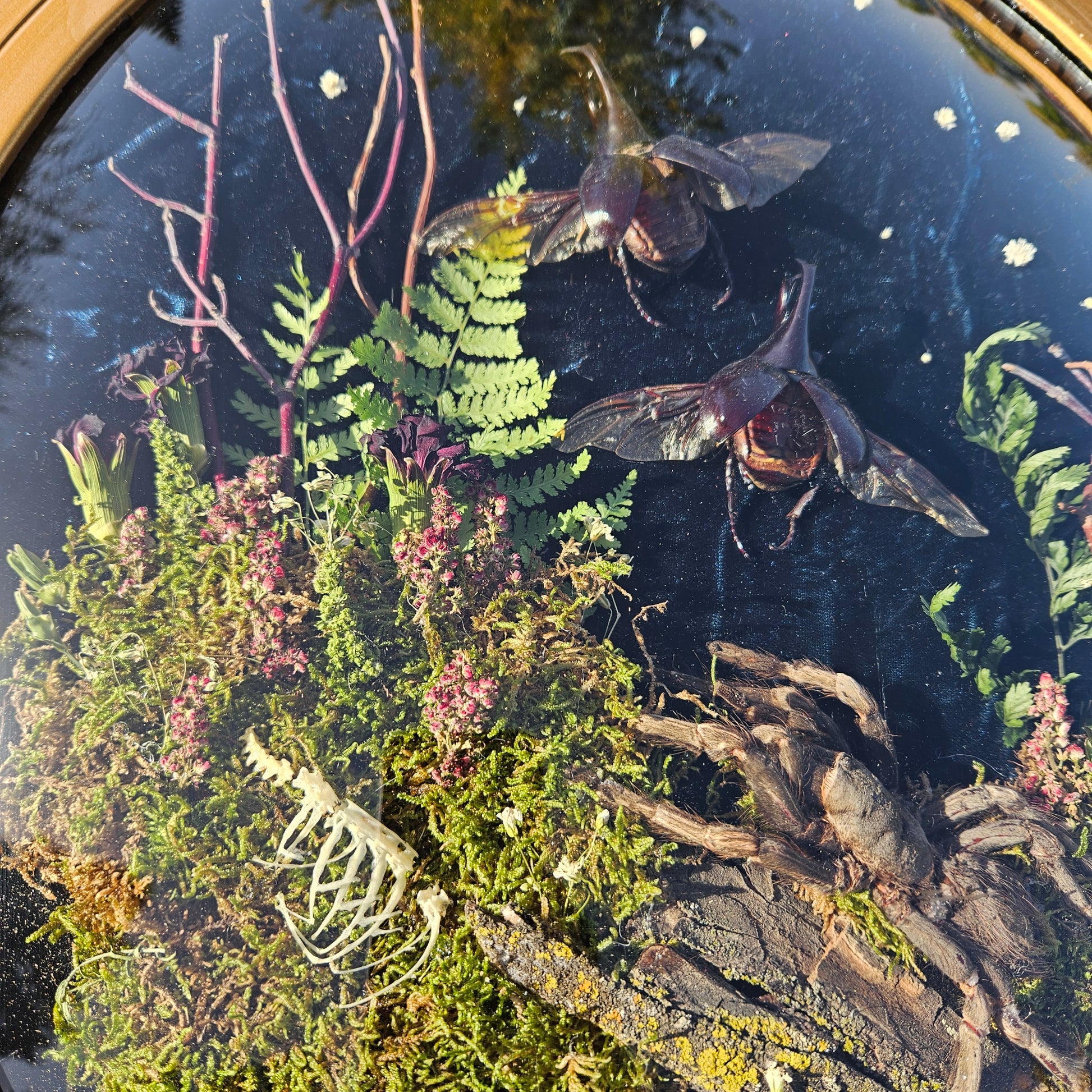 A gorgeous scene showing 2 beetles flying away, a tarantula and the ribcage of a starling bird. Shown on velvet in an antique wooden frame with bubble glass. Will not be cheap to ship.
