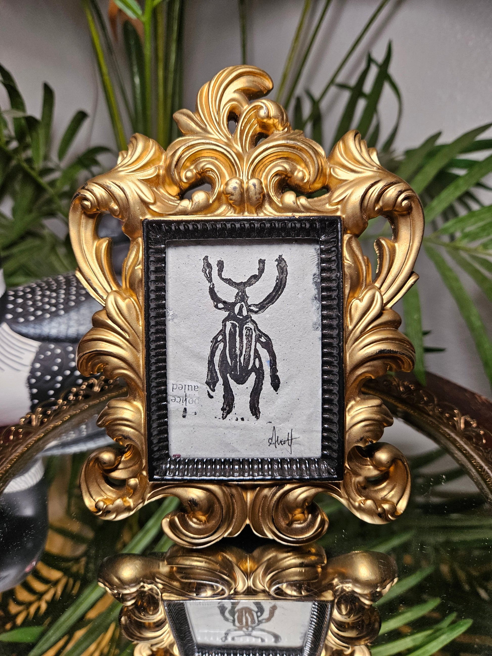 Rubber linocut weevil printed on in house recycled paper. Easel back vintage frame.